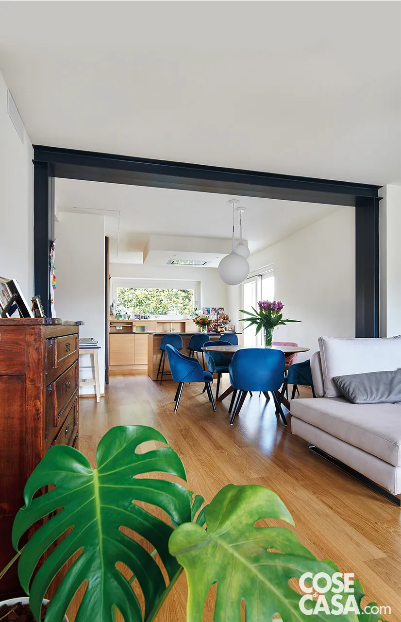 La riorganizzazione degli interni ha trasformato l’area giorno in un ambiente unico che gode, durante la giornata, di una luminosità naturale ininterrotta.