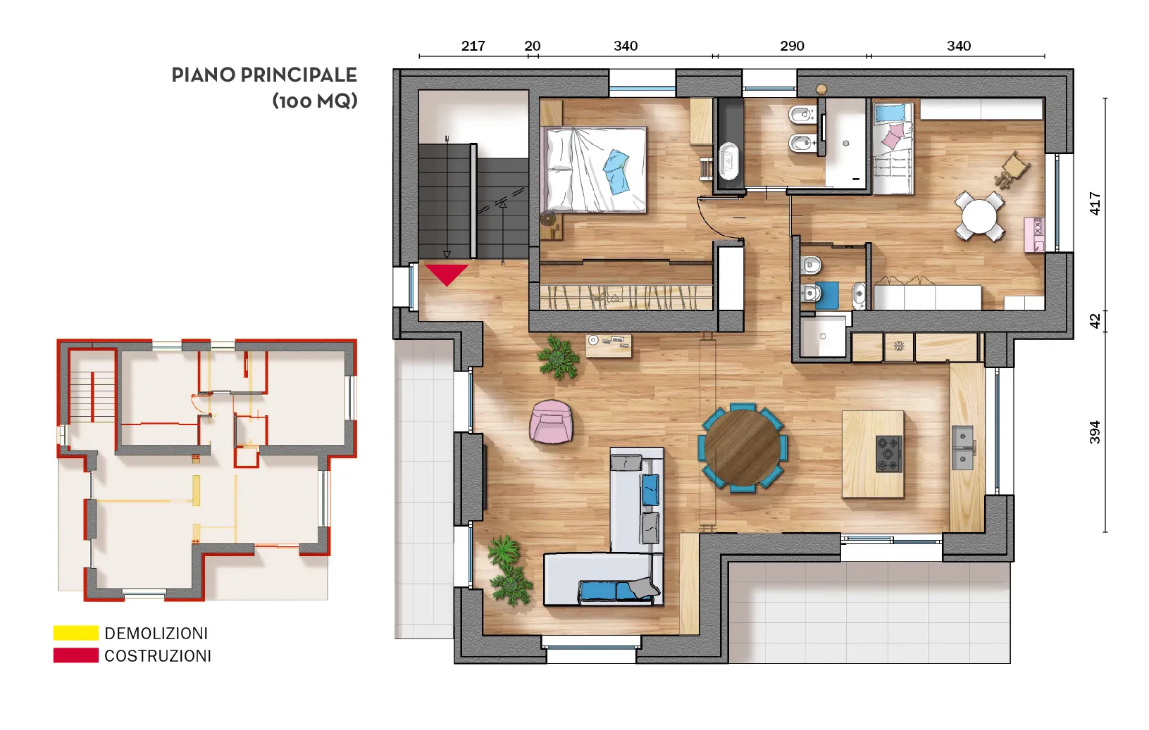 Piano principale di 100 mq con soggiorno, cucina, due camere e due bagni