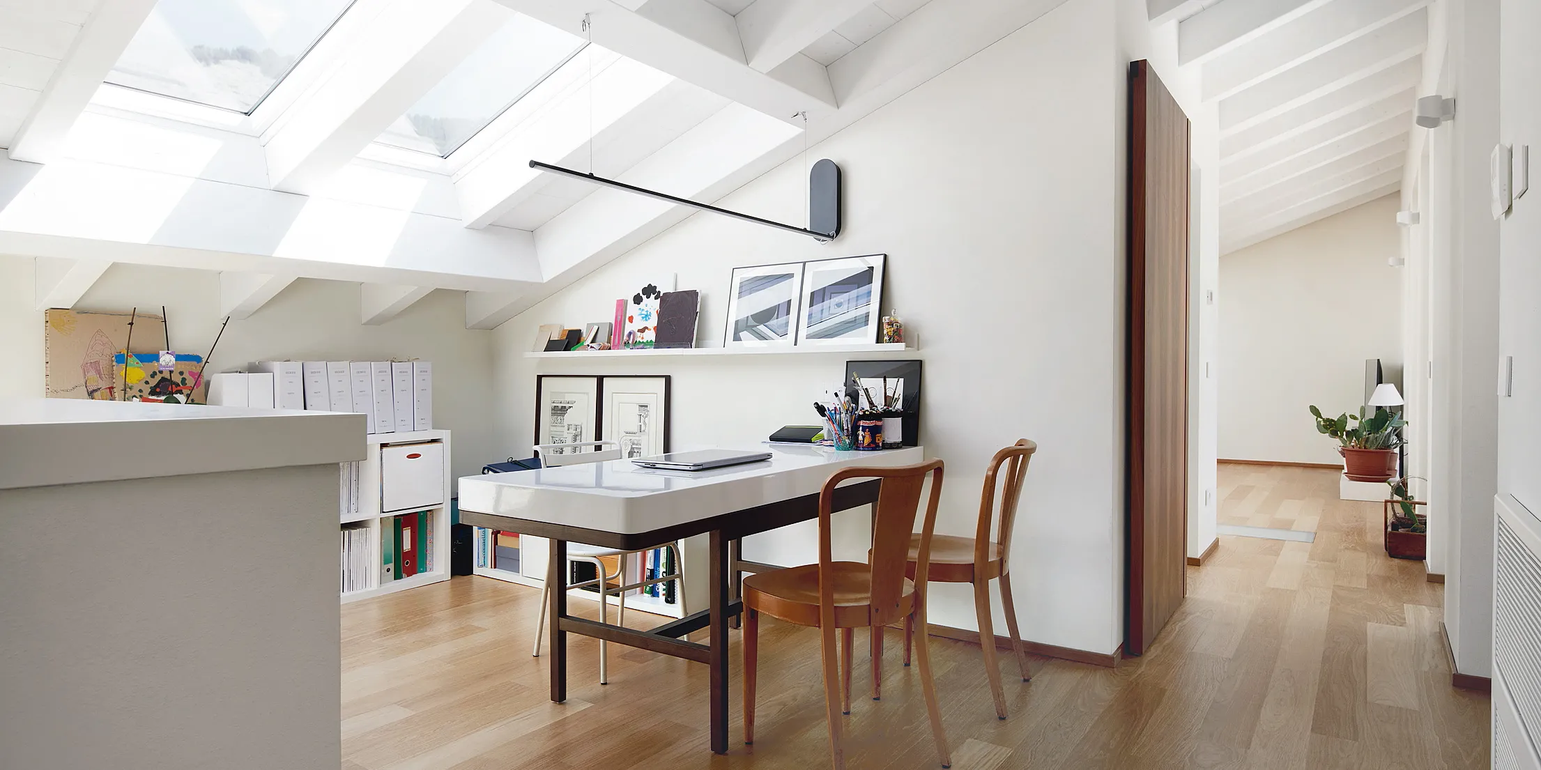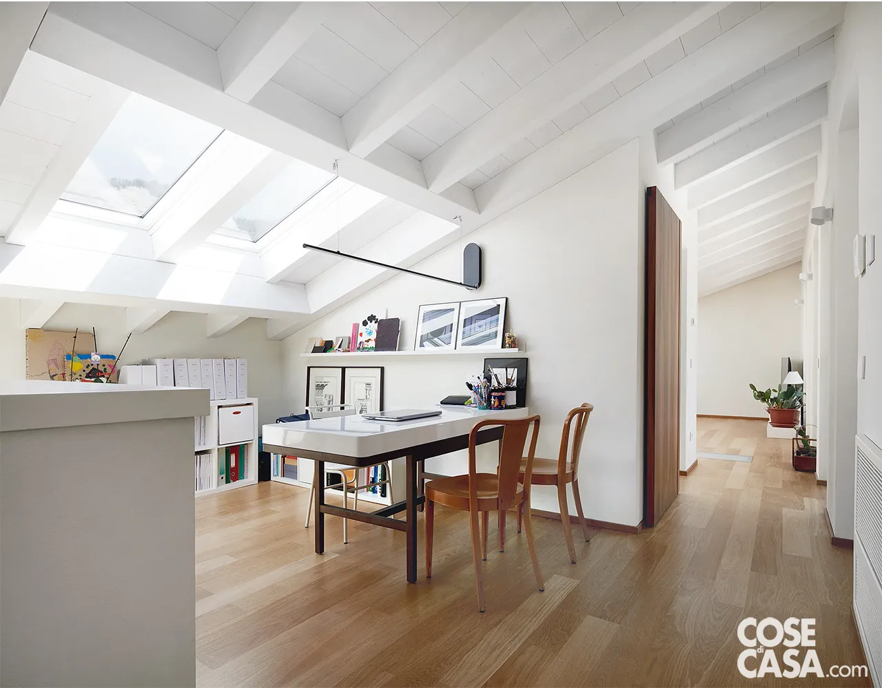 Tutta l’area del sottotetto è stata recuperata e ridisegnata per ricavare ambienti ampi e luminosi, come questo studio, ideale per lo smart working. Zone destinate a relax, hobby e contenimento, oltre a un bagno, completano il layout del piano.