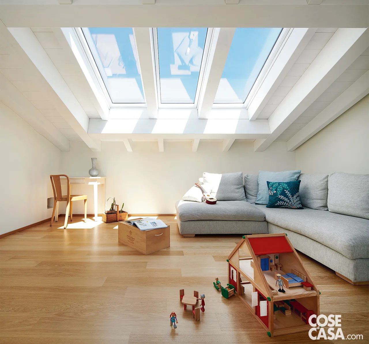 L’inserimento nel manto di sette finestremultiple è poi servito a trasformare completamente la mansarda, oltre naturalmente a illuminarla meglio, e a modellarne gli spazi.