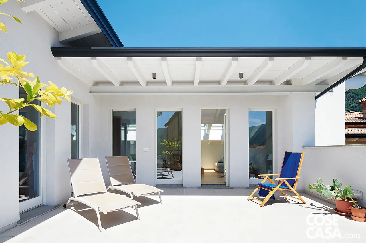 Il progetto per la nuova terrazza, oltre all’inserimento delle nuove aperture in serie, ha previsto il rifacimento del pavimento esterno, del vialetto e della scala, per i quali sono stati utilizzati rivestimenti di Florim (www.florim.com). Le sdraio che arredano la spazio esterno sono di Lafuma (www.lafuma.com).