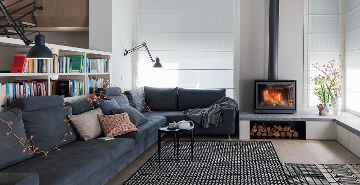 Il soggiorno è stato sistemato nel locale della casa ricavato in seguito all’ampliamento. La zona conversazione, illuminata da più aperture, una delle quali angolare, si sviluppa intorno al camino; il focolare (di Stuv) con canna fumaria a vista e senza alcun rivestimento, è appoggiato su un piano in beola che si dispiega su due lati sfruttando l’altezza del sottofinestra; è stato realizzato da A.F. Arredi su disegno del progettista. Il divano angolare è di Villa Italo, così come la libreria alle spalle dello schienale che divide il living dal vano scala retrostante; i cuscini e il tavolino Tray Table sono di Fritz Hansen, le applique a braccio orientabile di Ikea. I kilim in lana sono della serie Doodle Hatch di I+I, design Paolo Giordano.
