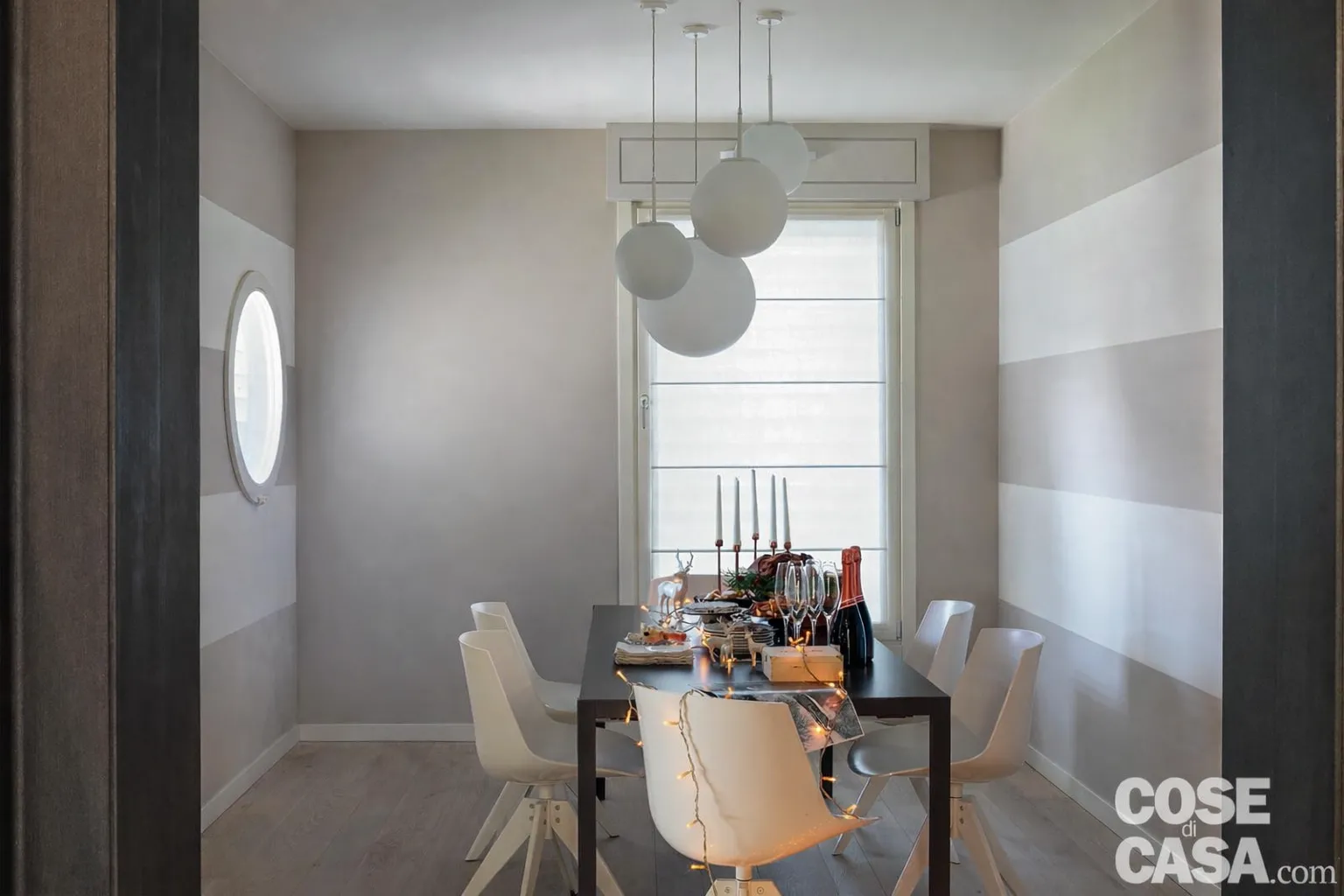 Nella zona pranzo di gusto minimal al tavolo essenziale sono abbinate sedie di design e lampade sferiche che scendono ad altezze differenziate. Nella zona pranzo come nel vano scala, le particolari aperture a oblò con infissi in legno sono state realizzate durante la ristrutturazione per dare così più luce alla casa. Tutti gli altri serramenti sono stati sostituiti da più efficienti modelli con vetrocamera a taglio termico, in alcuni casi ampliando le luci esistenti: in diverse stanze le finestre hanno la misura e la forma di portefinestre.