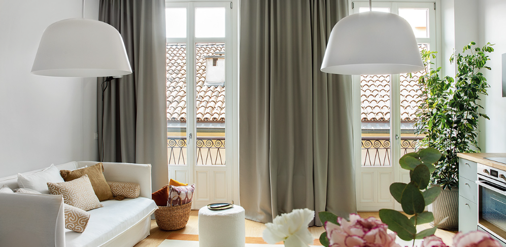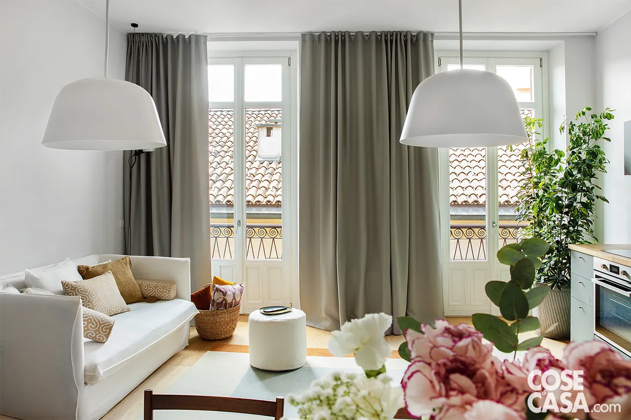 Nell’ambiente giorno le due porte-finestre affiancate non affacciano su balconi ma su poggioli esterni in ferro battuto: dal quarto e ultimo piano, la particolarità è la vista sui tetti, nel cuore della città.