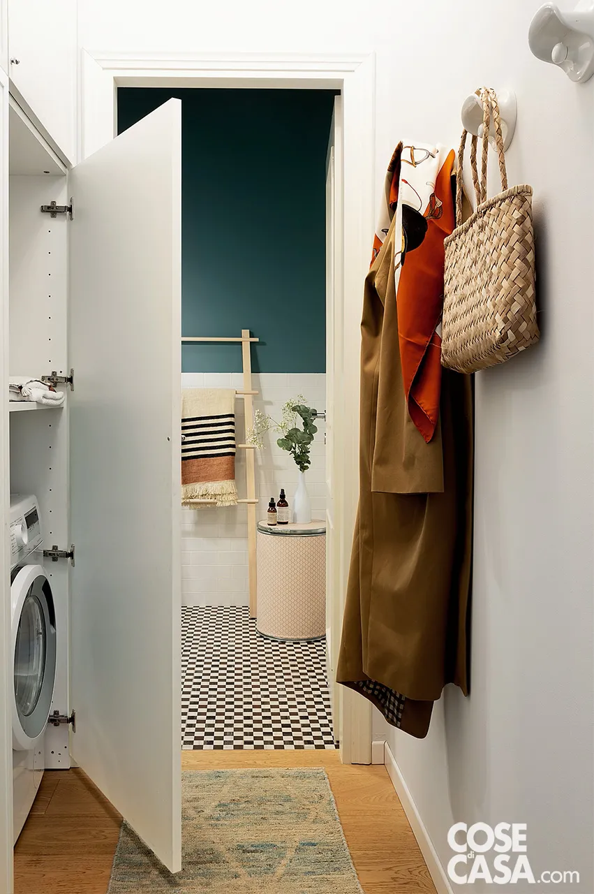 Il layout prevedeva già in origine un antibagno che, come richiede la normativa, disimpegna l’ambiente di servizio dalla zona cottura e dal resto dell’abitazione. Questo spazio di passaggio, un mini corridoio a destra dell’ingresso, è ora sfruttato con un’armadiatura su misura che integra lavanderia e ripostiglio.