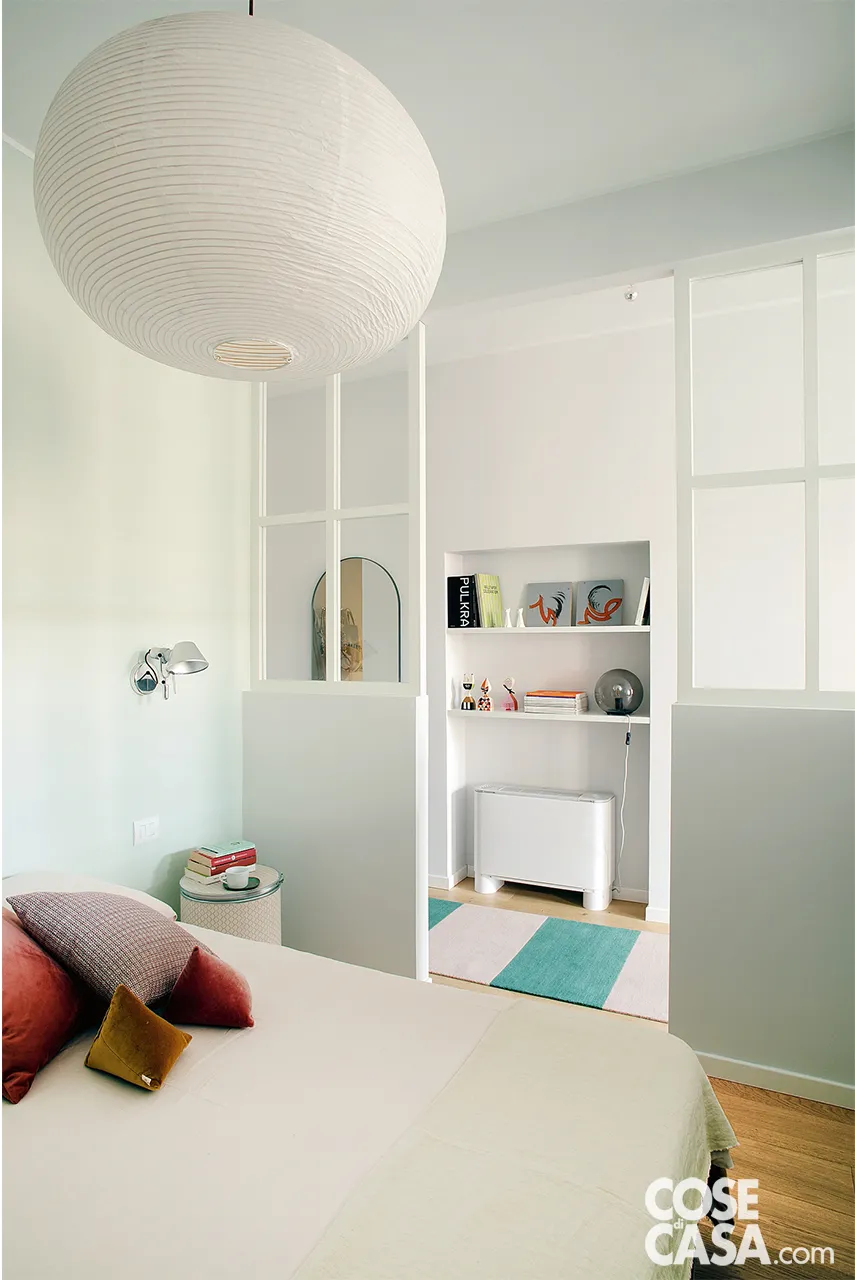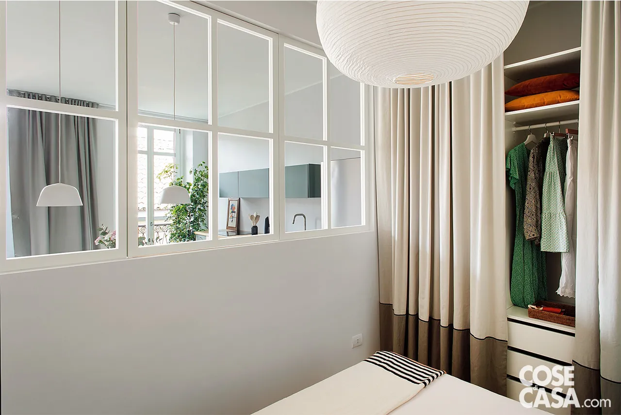 Nella zona notte, al di là della vetrata, l’armadio stender a parete è realizzato con una struttura modulare in laminato di Ikea; tendaggi misto lino con bordi a contrasto di Villa Italo. Lampada a sospensione in carta di Hay.
