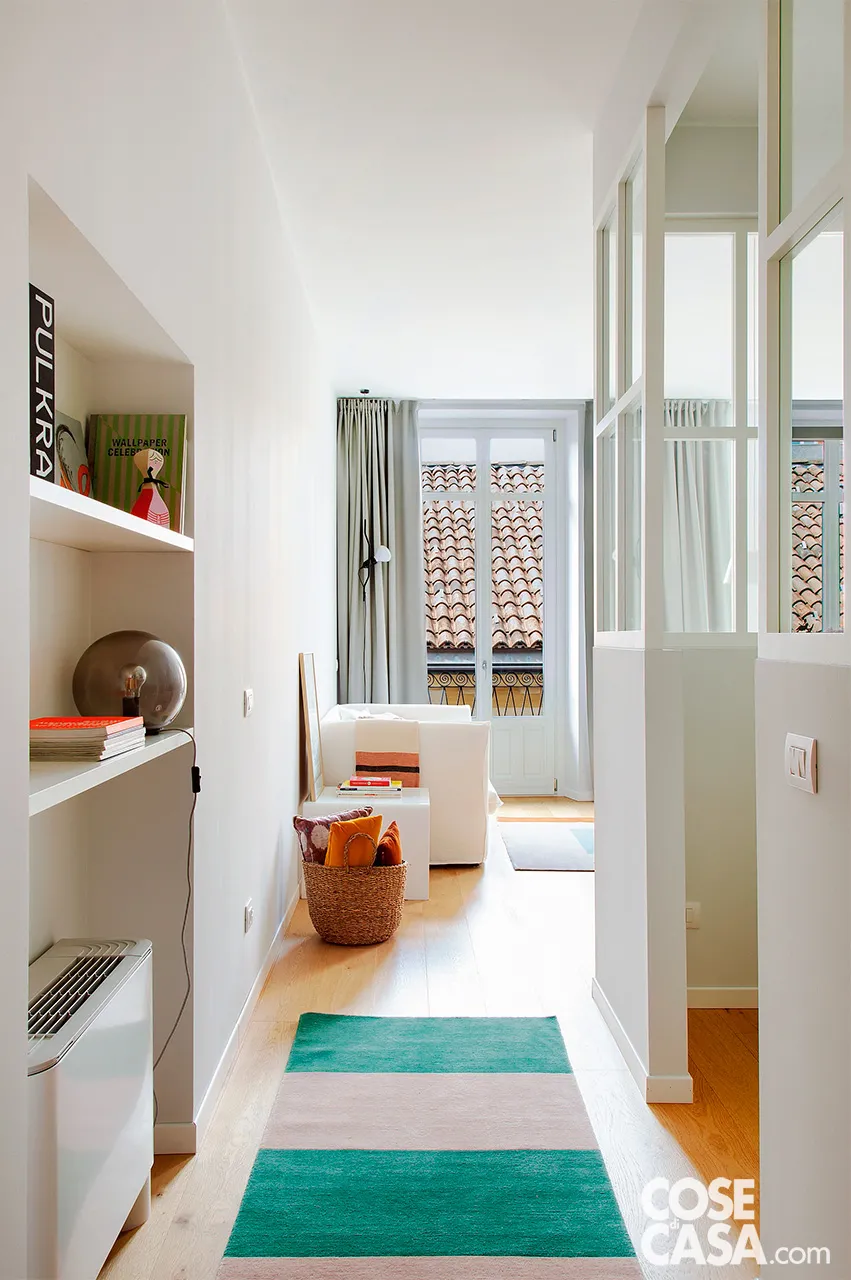 Nel corridoio, la passatoia a strisce verdi e grigie è della collezione Relazioni di Alberto Levi Gallery, design Clara Bona. A sinistra, nella nicchia a ripiani, lampada da appoggio di Ikea e bambole di Vitra. Fancoil per riscaldamento e climatizzazione FCZ di Aermec. In fondo, nell’angolo della zona conversazione vicino alla porta-finestra, lampada a sospensione Parentesi di Flos.