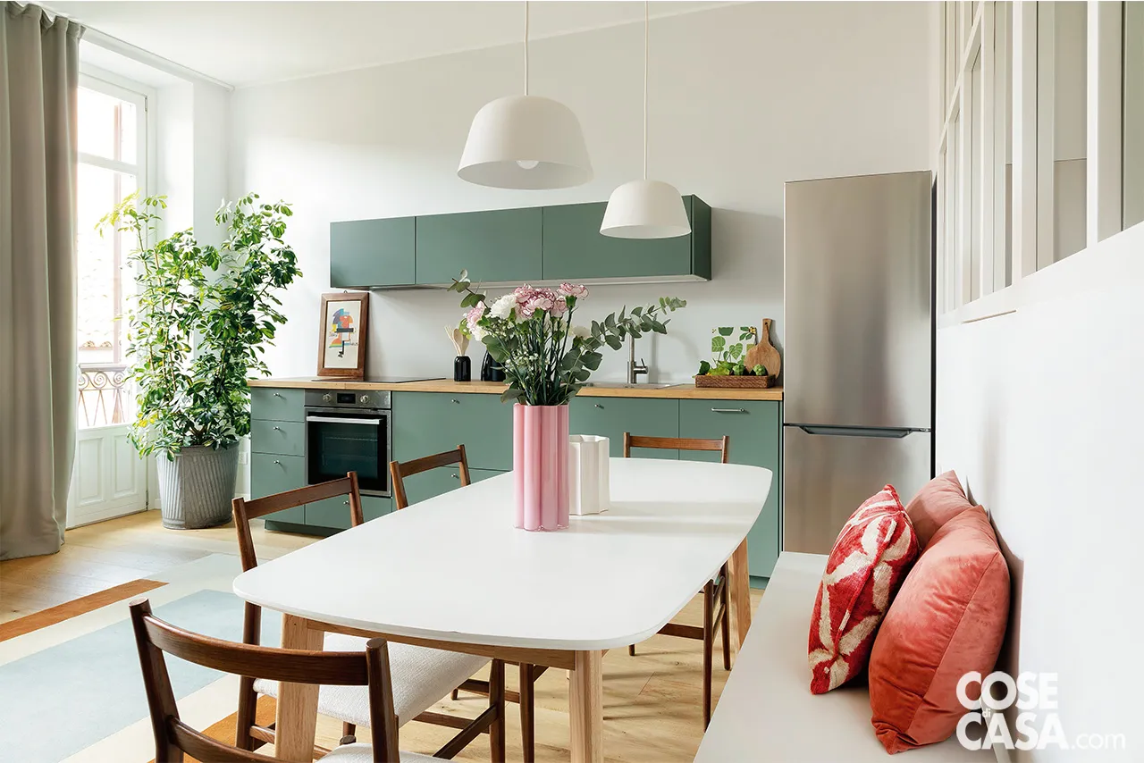 Nell’ambiente giorno del monolocale, la composizione della cucina in laccato verde muschio è realizzata con moduli Ikea; stesso brand per il forno e il frigorifero combinato inox. I vasi neri sul top sono di Changing Atmosphere, design Guia Bartolozzi; quelli bianco e rosa sul piano del tavolo da pranzo sono di The Socialité Family. Sulla panca, cuscini Ikat di Alberto Levi Gallery.