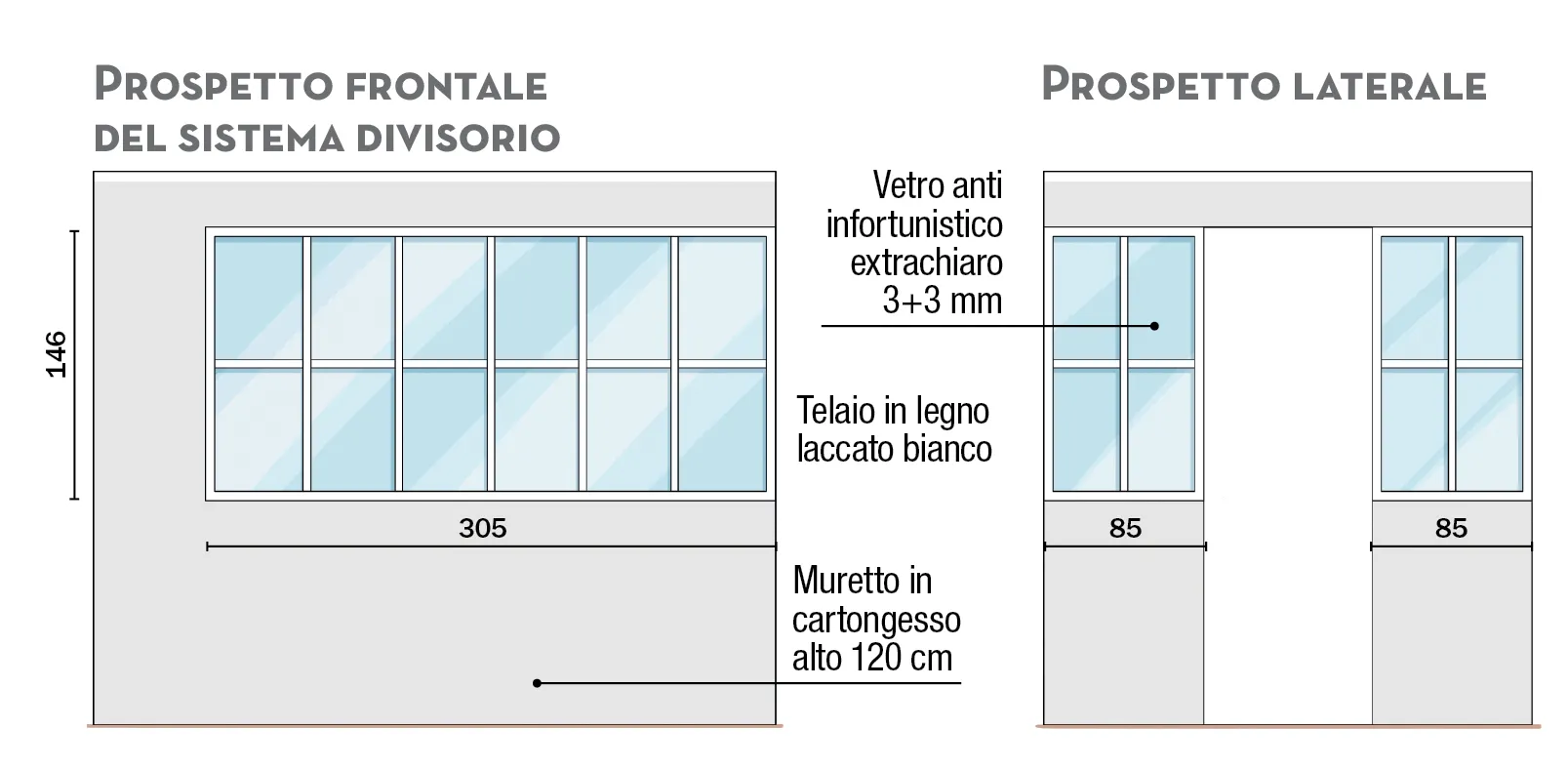 Nell’ambiente unico, per garantire una certa autonomia alla zona con il letto, è stata realizzata una struttura divisoria in cartongesso alta 120 cm. Sopra questo “muretto” poggia un sistema rimovibile con telaio in legno suddiviso a riquadri e lastre in vetro antinfortunistico 3+3 mm; si tratta di vetro extrachiaro, quindi perfettamente trasparente senza riflessi colorati; l’anta centrale è incernierata e si apre a battente, gli altri sono pannelli fissi. La vetrata prosegue sul lato ortogonale verso il corridoio; l’ingresso del vano notte è aperto e privo di serramenti.