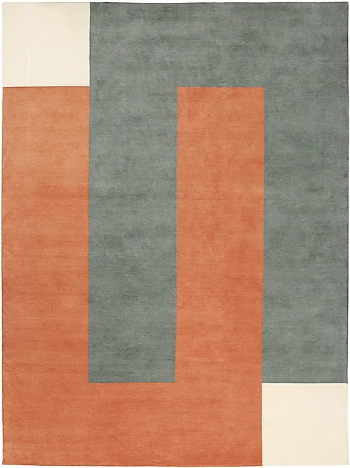 Il tappeto davanti al divano, disegnato dall’architetto Clara Bona e annodato a mano in Nepal, parte dall’uso di forme geometriche combinate a una palette di colori pieni, in composizioni armoniche. Il motivo nasce da una griglia in cui figure e campiture prendono forma, intersecandosi in un gioco di pieni e vuoti in equilibrio.