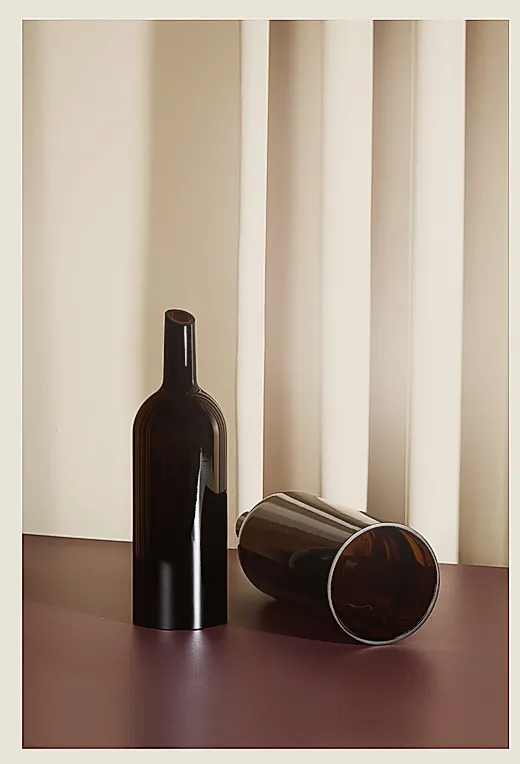 Neri, lucidi e opachi, appoggiati sul top della cucina e sulle mensole, nascono dalla creatività di una delle progettiste. Sono realizzati con bottiglie da vino di stock, scartate da una vetreria. Ogni pezzo è unico, tagliato e molato artigianalmente: l’idea è quella di trasformare un semplice prodotto industriale in un bell’oggetto da esporre.