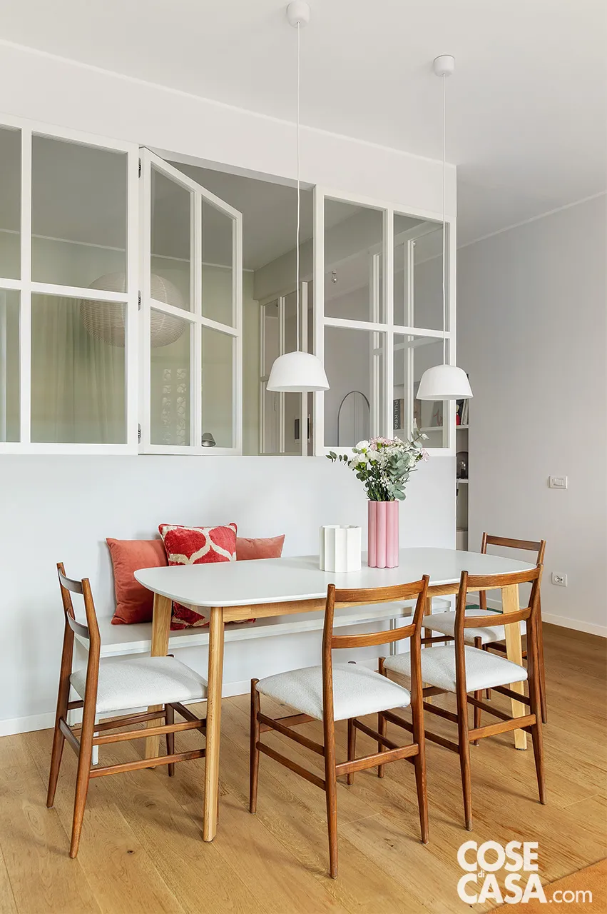 - Nella zona pranzo la panchetta e il tavolo sono allineati al muretto in cartongesso che, sormontato dalla vetrata, separa lo spazio del riposo dal living.
