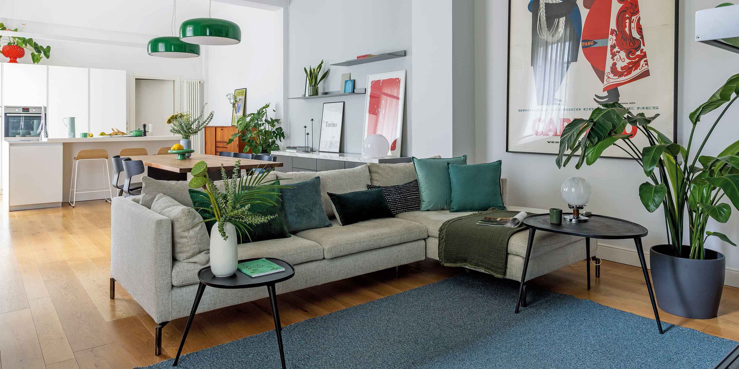 Nell’open space della zona giorno, l’estremità più vicina all’ingresso ospita il living, arredato con un divano angolare (modello Reef di Novamobili, completato da cuscini di Coin e di Maisons du Monde) che definisce l’area conversazione. I tavolini neri sono di Zara Home. Il plaid, il mug verde sul coffee table a destra, il vaso bianco sul piano a sinistra sono di Ikea. Tappeto blu in lana di Kasthall. Le pareti sono tinteggiate con idropitture di Sikkens.