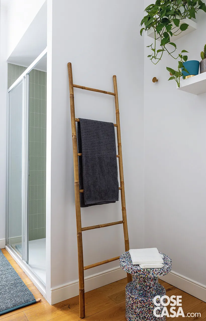 Il box doccia in nicchia è il modello Pamela Evolution di PDP. L’asciugamano blu sulla scaletta è di Ikea; quello bianco a nido d’ape piegato sullo sgabello Bit Stool di Normann Copenhagen è di Bellora 1883.