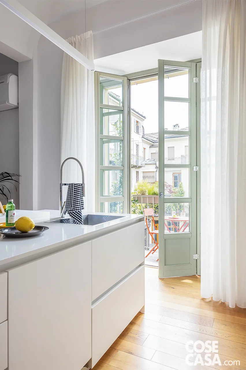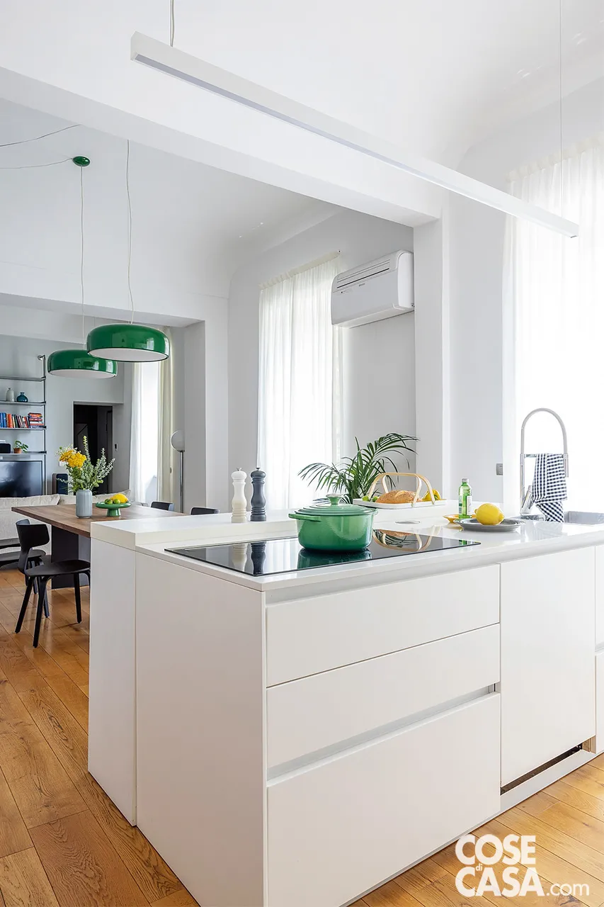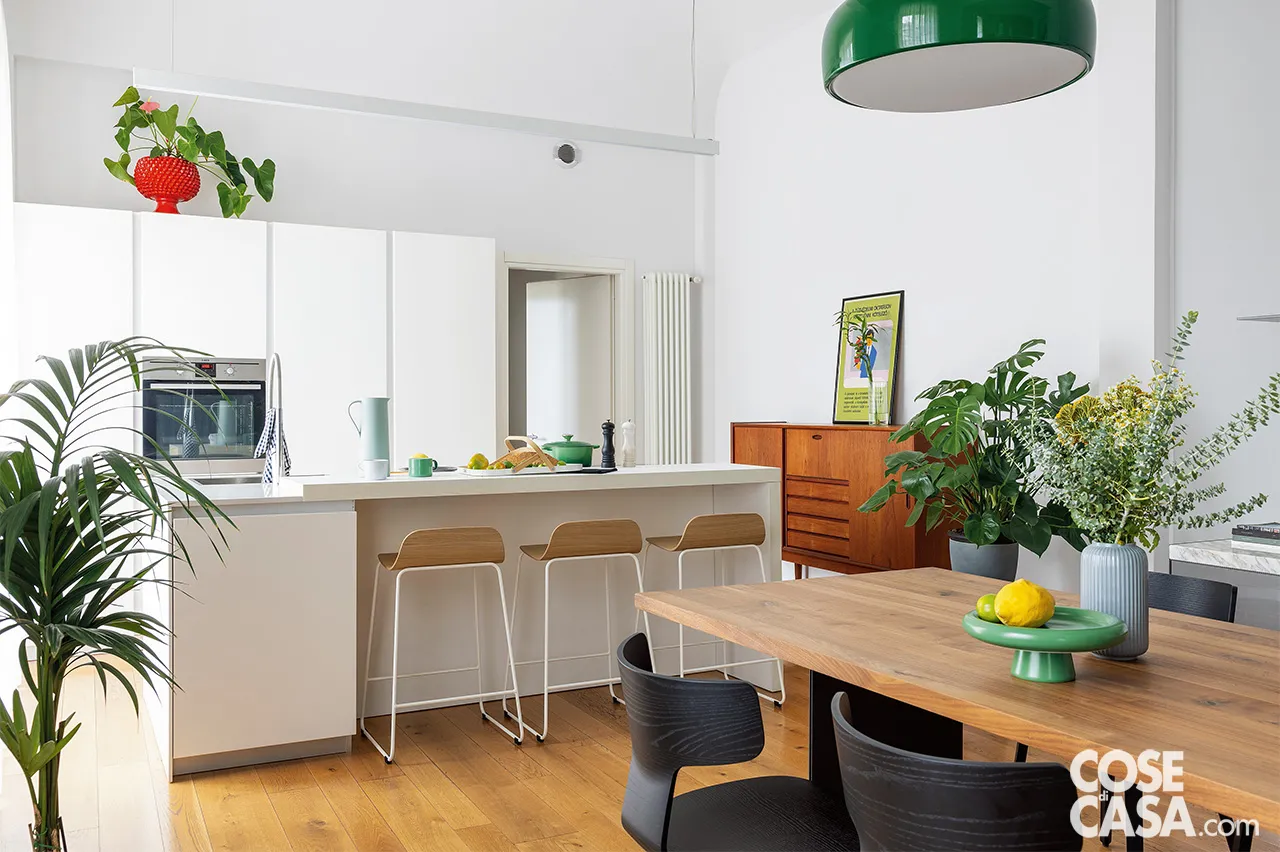 L’isola centrale è illuminata dalla lampada a sospensione M-Eco di TeamItalia; gli sgabelli accostati al bancone snack sono il modello Bisell Metal di Treku. La casseruola verde, la saliera e pepiera e i piatti sono di Le Creuset, il vassoio bianco con i manici è di Ikea. A destra in primo piano, sul tavolo da pranzo, alzatina verde di Maisons du Monde e vaso grigio di Ikea. È stato conservato il parquet preesistente in listoni di rovere posato a correre.