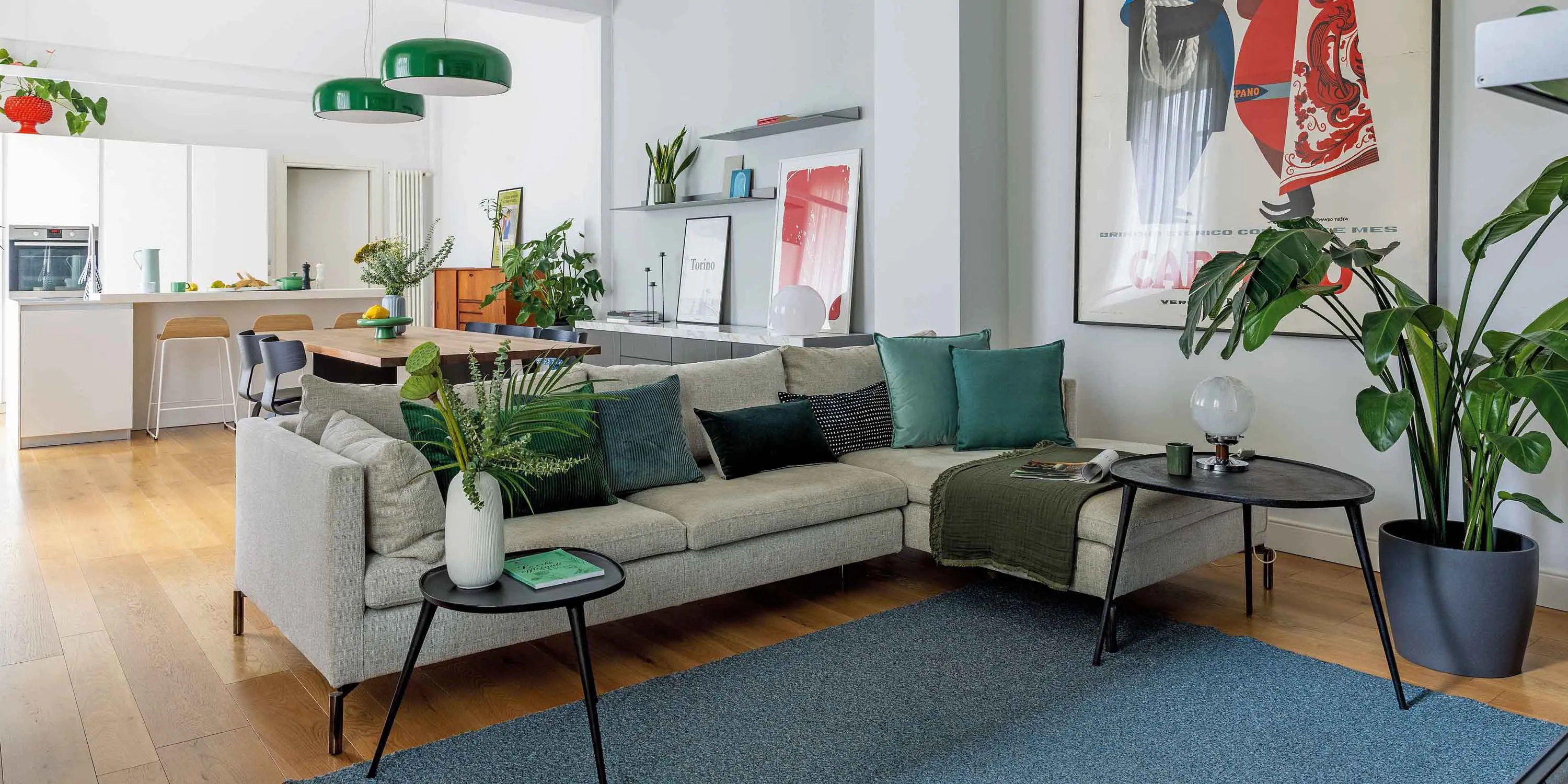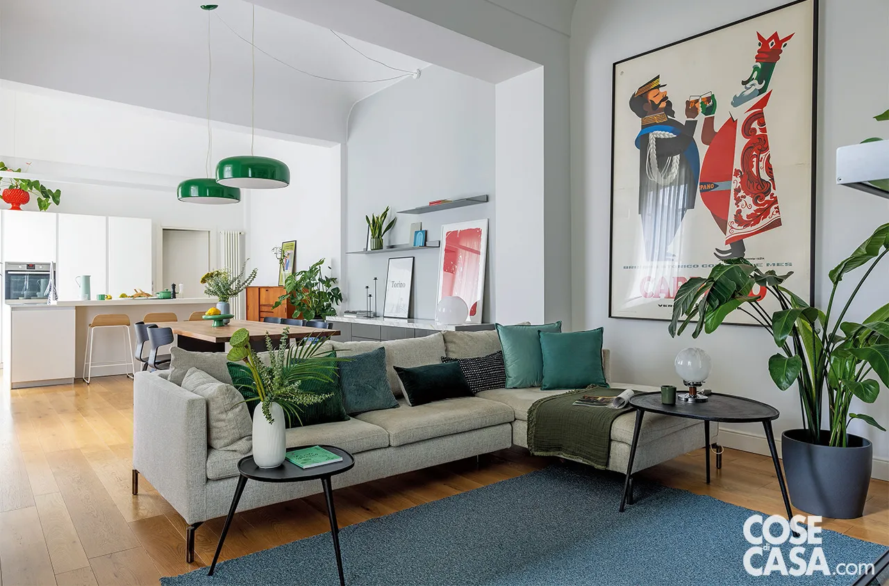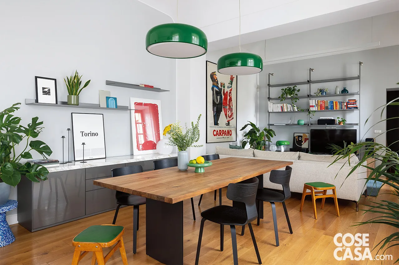 Nell’ambiente aperto accenti di verde e di rosso, colori complementari, spiccano sugli sfondi neutri delle pareti bianche e del pavimento in parquet, definendo la personalità degli spazi giorno.