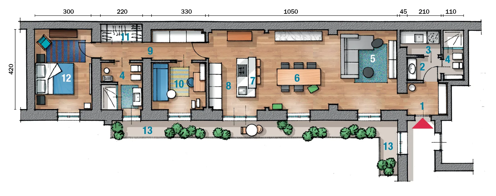 - 1 Ingresso 2 Antibagno 3 Lavanderia 4 Bagno 5 Soggiorno 6 Zona pranzo 7 Isola 8 Cucina 9 Disimpegno 10 Studio 11 Cabina armadio 12 Camera matrimoniale 13 Balconata