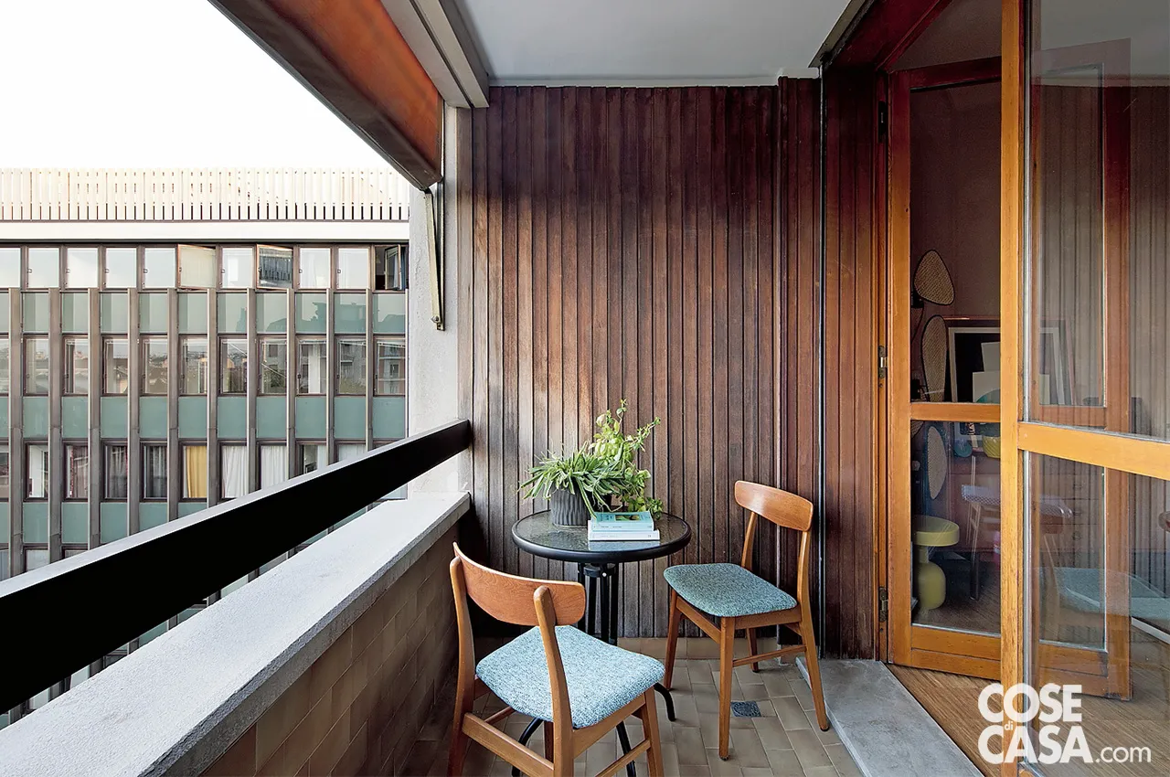 Coperti in alto con rivestimenti originali in perline presumibilmente in essenza douglas come i serramenti e con tendaggi frontali a rullo, i due balconi a loggia di soggiorno e camera assumono l’aspetto di verande abitabili. La continuità tra interno ed esterno è sottolineata dalla vetrata terra-cielo; le superfici e la profondità degli spazi outdoor li rendono sfruttabili con tavolo, sedie e altri elementi d’arredo.
