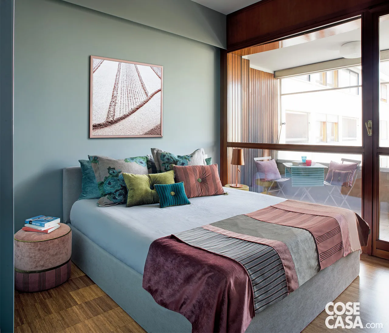 Nella camera matrimoniale la palette cromatica vira nei toni dell’azzurro e verde acqua, mentre a complementi e tessile è affidato il compito di addolcire l’insieme con nuance di rosa desaturato.
