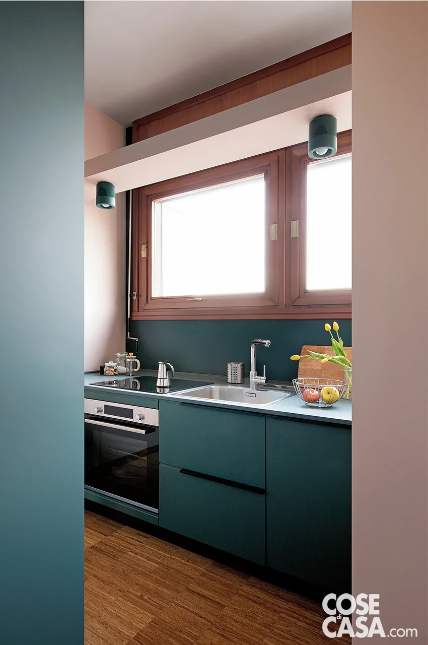 In cucina le basi in laccato verde petrolio e le colonne sul lato opposto fanno parte del programma Tratto10 di Arredo3 (tutto acquistato da Format Home). I faretti installati sotto la mensola in cartongesso sono di Ferroluce. I serramenti in legno sono originali degli anni ’70.