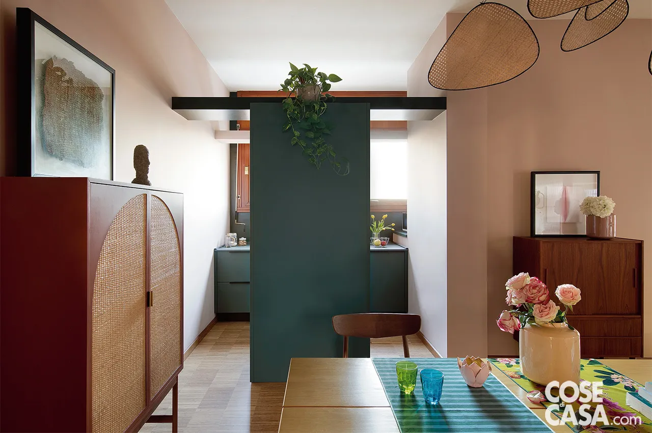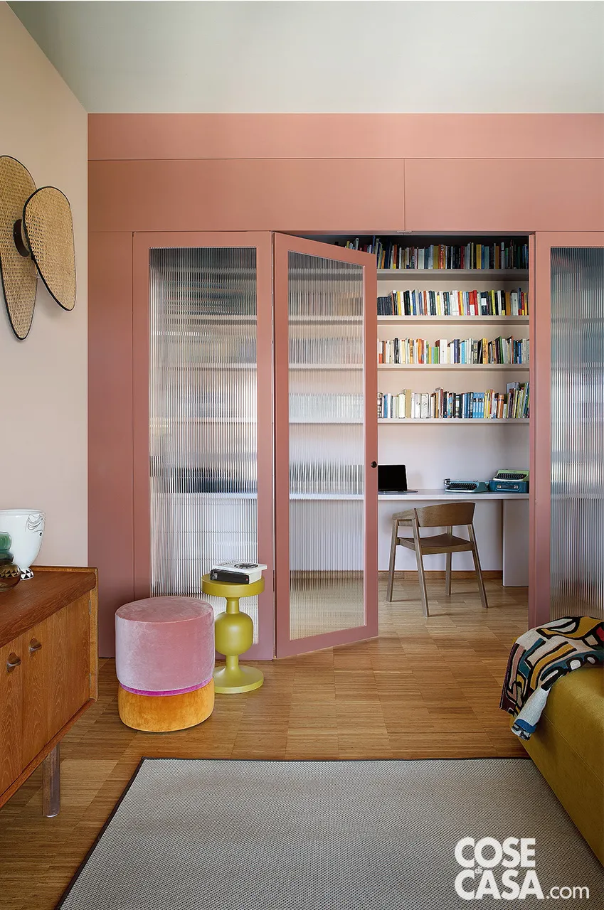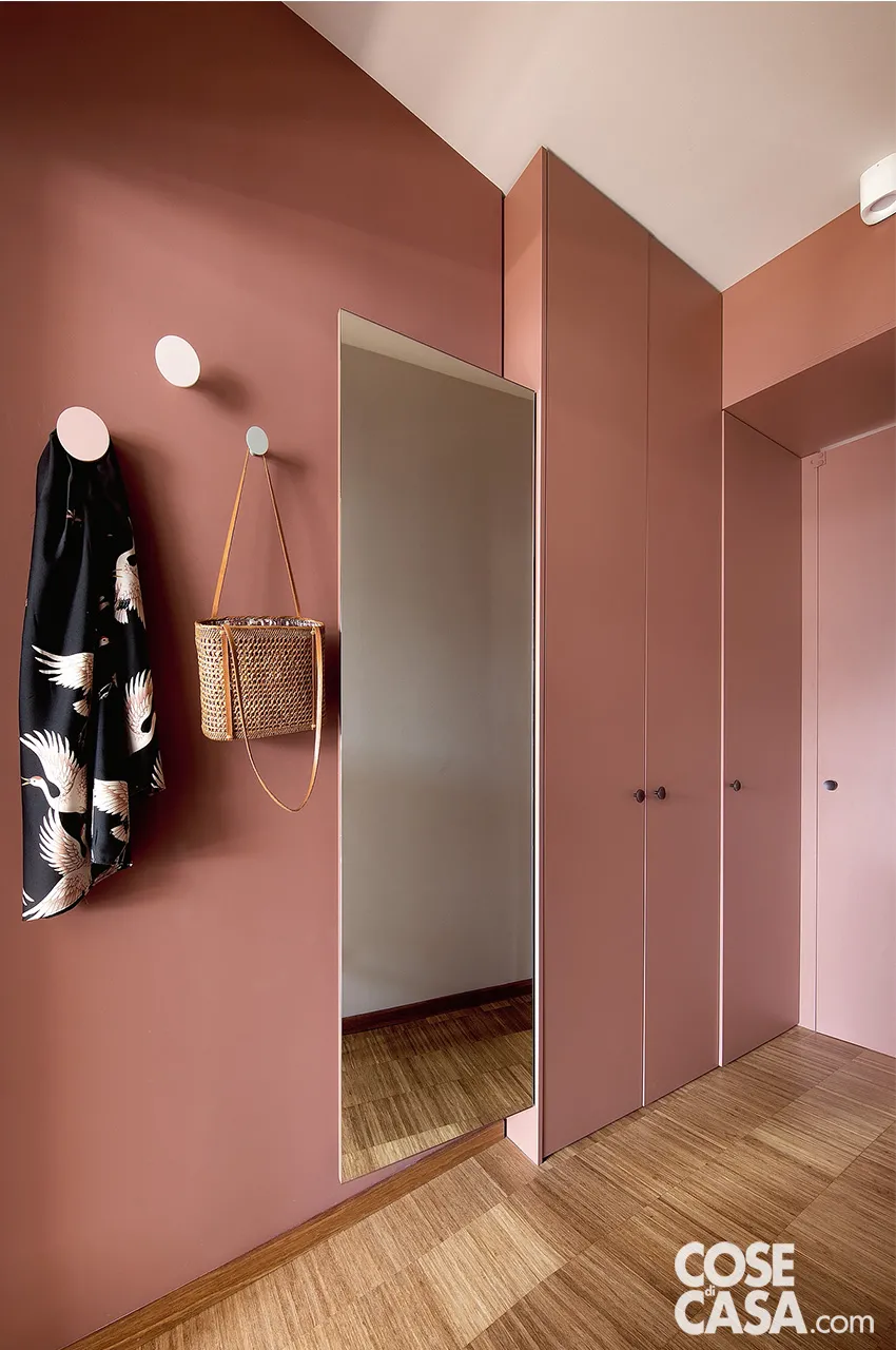 Per definire la scansione interna e il nuovo schema compositivo, i progettisti hanno fatto un uso architettonico del colore che ha tenuto conto degli stilemi anni ’70 degli interni. Tra l’ingresso e la zona notte, superfici uniformi in tonalità rosa “felpato” avvolgono oralo spazio di passaggio e dialogano con i colori scelti per la camera matrimoniale e il bagno