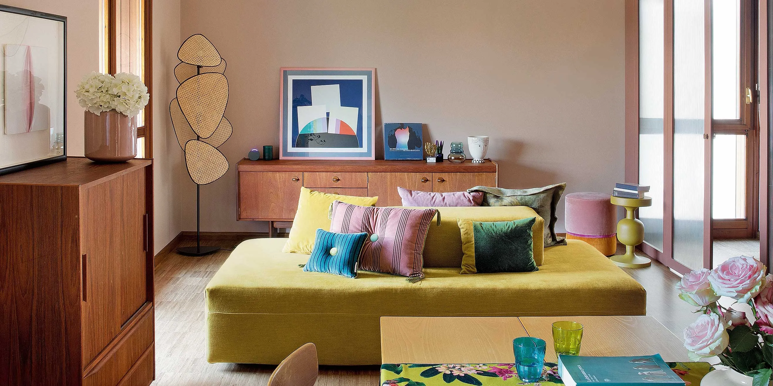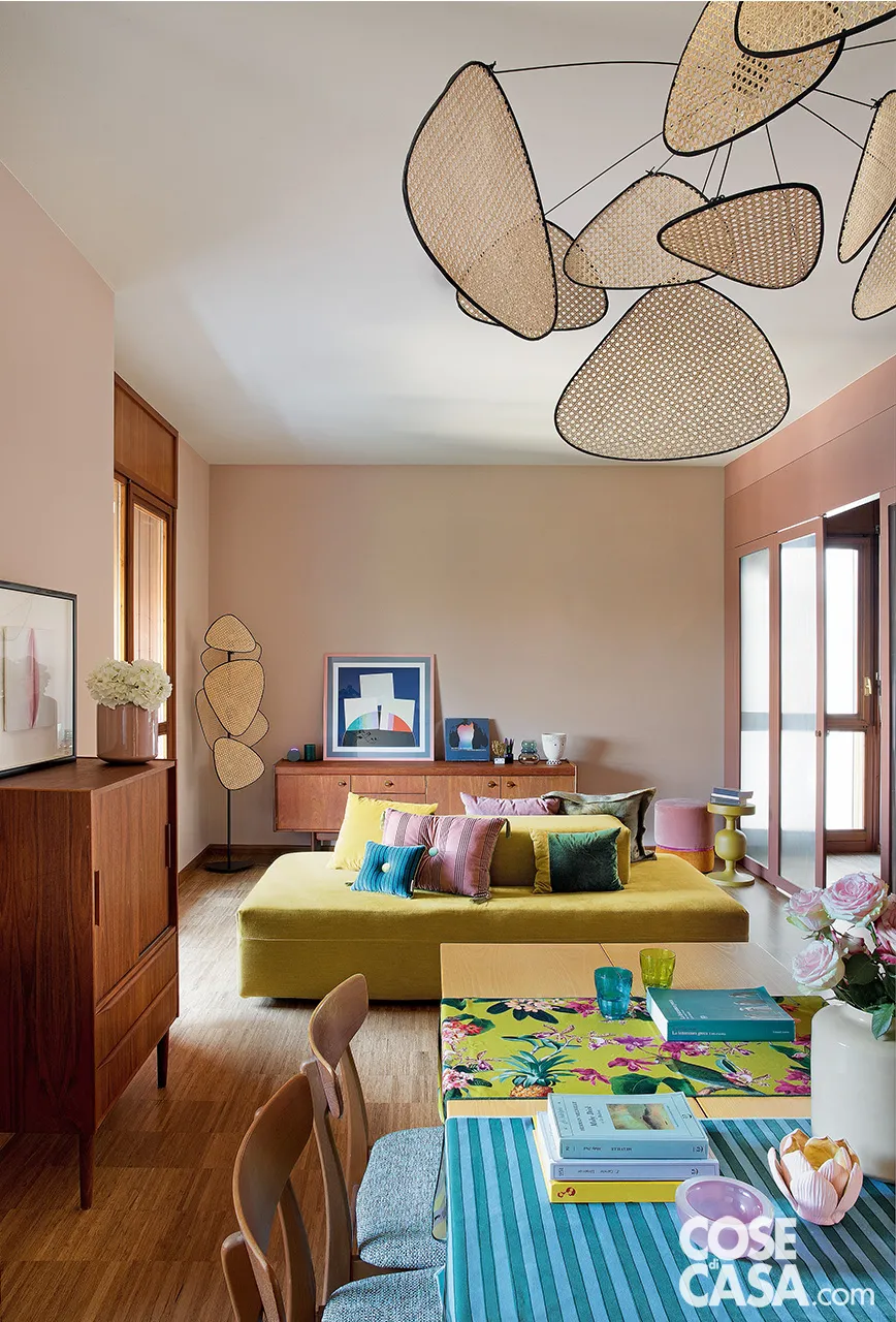 Soggiorno con pareti rosa cipria e divano bifacciale color senape