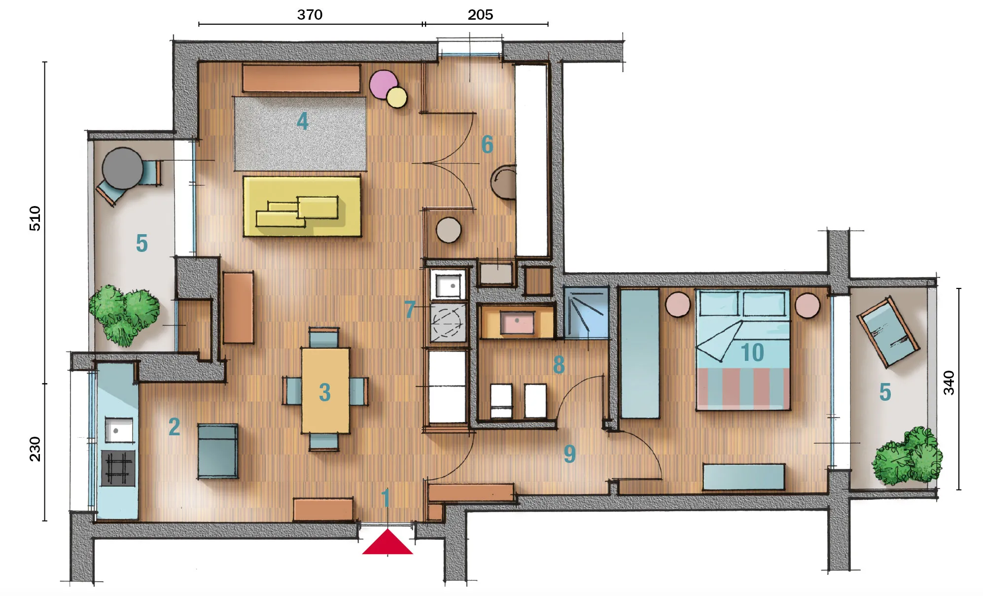 1 Ingresso 2 Cucina 3 Zona pranzo 4 Soggiorno 5 Balcone 6 Studio 7 Lavanderia 8 Bagno 9 Disimpegno 10 Camera matrimoniale