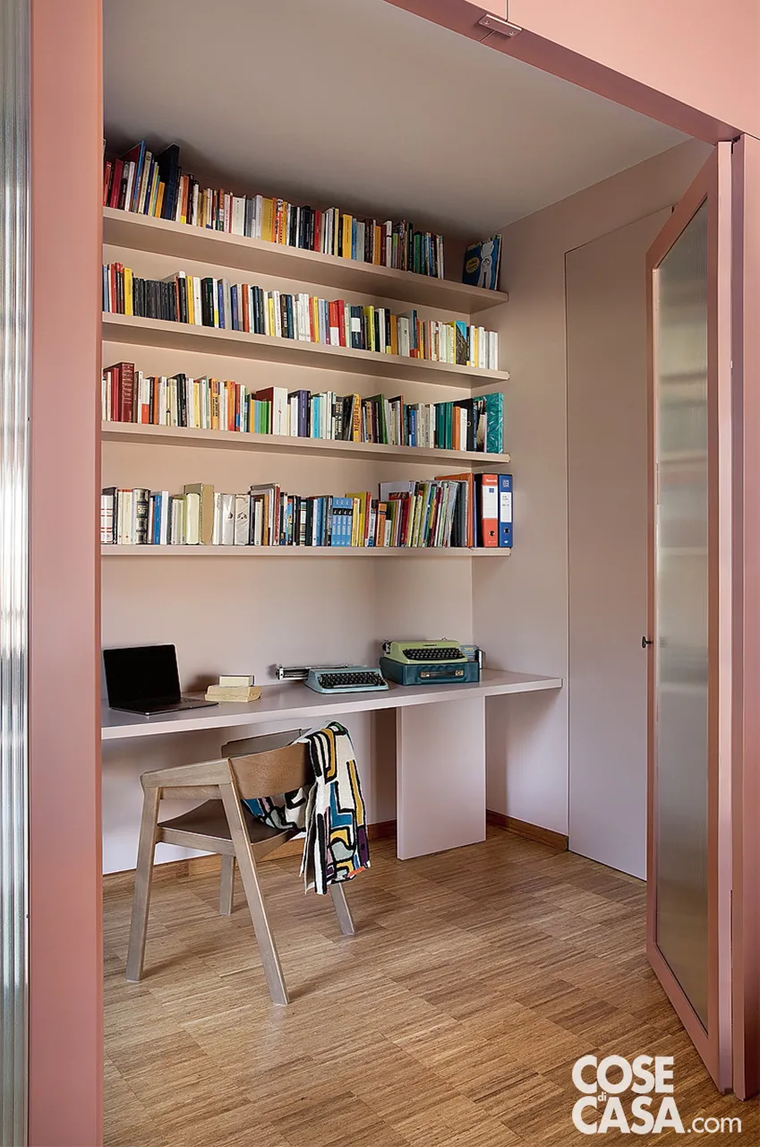 - Lo studio occupa lo spazio d’angolo tra la zona giorno e il blocco centrale dei servizi. La stanza è delimitata internamente da una parete in vetro cannettato che la separa dal living e che lascia filtrare la luce.