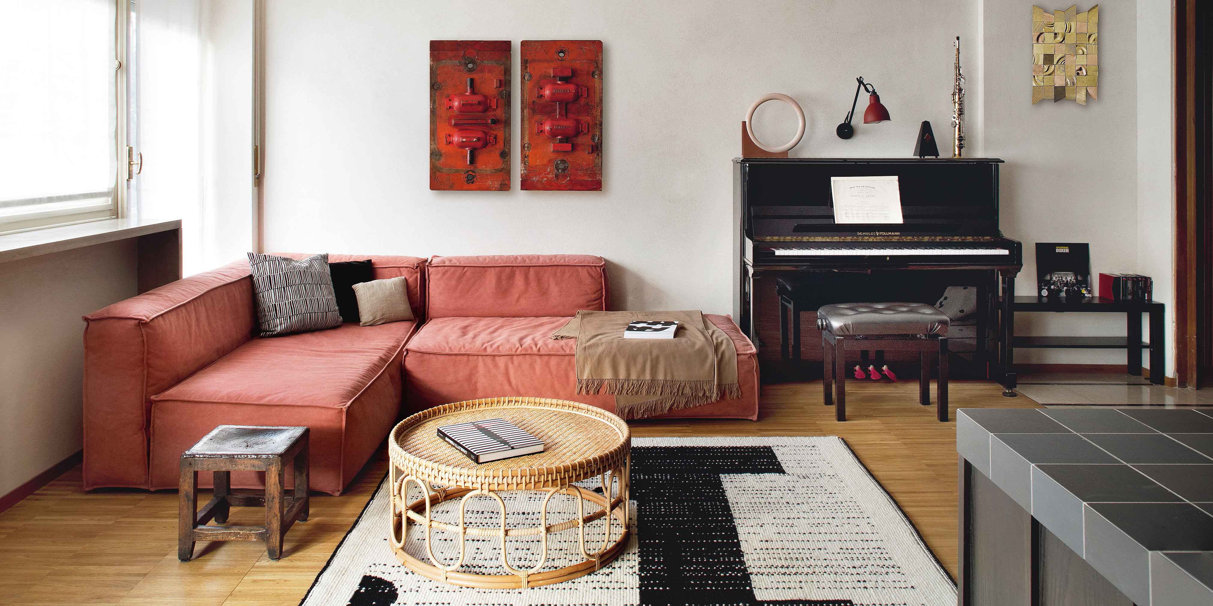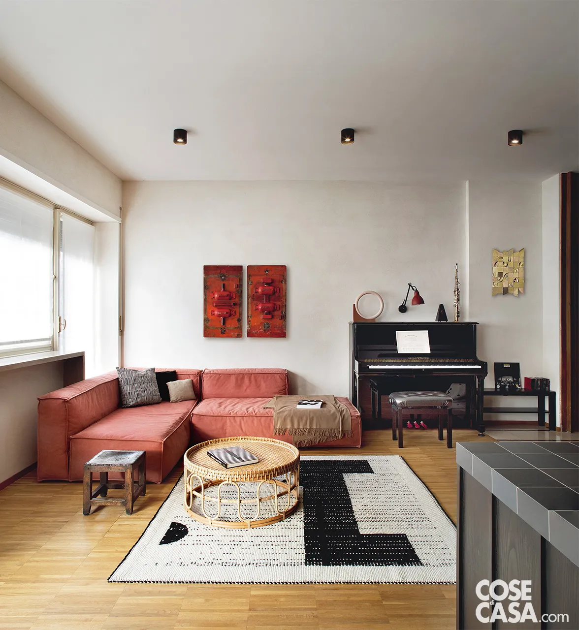 Nell’angolo conversazione del living il divano modulare della serie Long Island di Cargo High Tech è rivestito in tessuto color salmone. Il tavolino rotondo in rattan è il modello Samson di Tikamoon. Tappeto in lana di Mustras realizzato a mano da Vilma Ghiani su disegno di Giorgios Papaevangeliou. Le sculture a muro sono opera di Fabio Zanino. Sopra il pianoforte, vaso di Mustras (design Fabrizio Felici, realizzazione Walter Usai).
