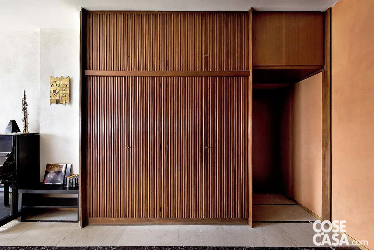 L’armadio a ponte, a tutt’altezza con frontali cannettati in massello di teak, fa parte degli elementi d’arredo preesistenti, riadattati al nuovo contesto. In questo caso non è cambiata nemmeno la posizione del mobile la cui fascia superiore incornicia la porta d’ingresso della casa.