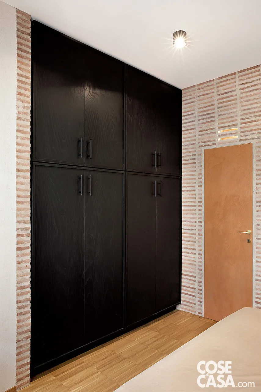 L’armadio a muro scuro lungo la parete di fronte al letto è stato realizzato su disegno dei progettisti in frassino locale e tinto con un prodotto naturale dello stesso tipo di quello impiegato per la libreria all’ingresso e i mobili della cucina. Come la maggior parte degli arredi custom made presenti nell’abitazione, è in legno massello.