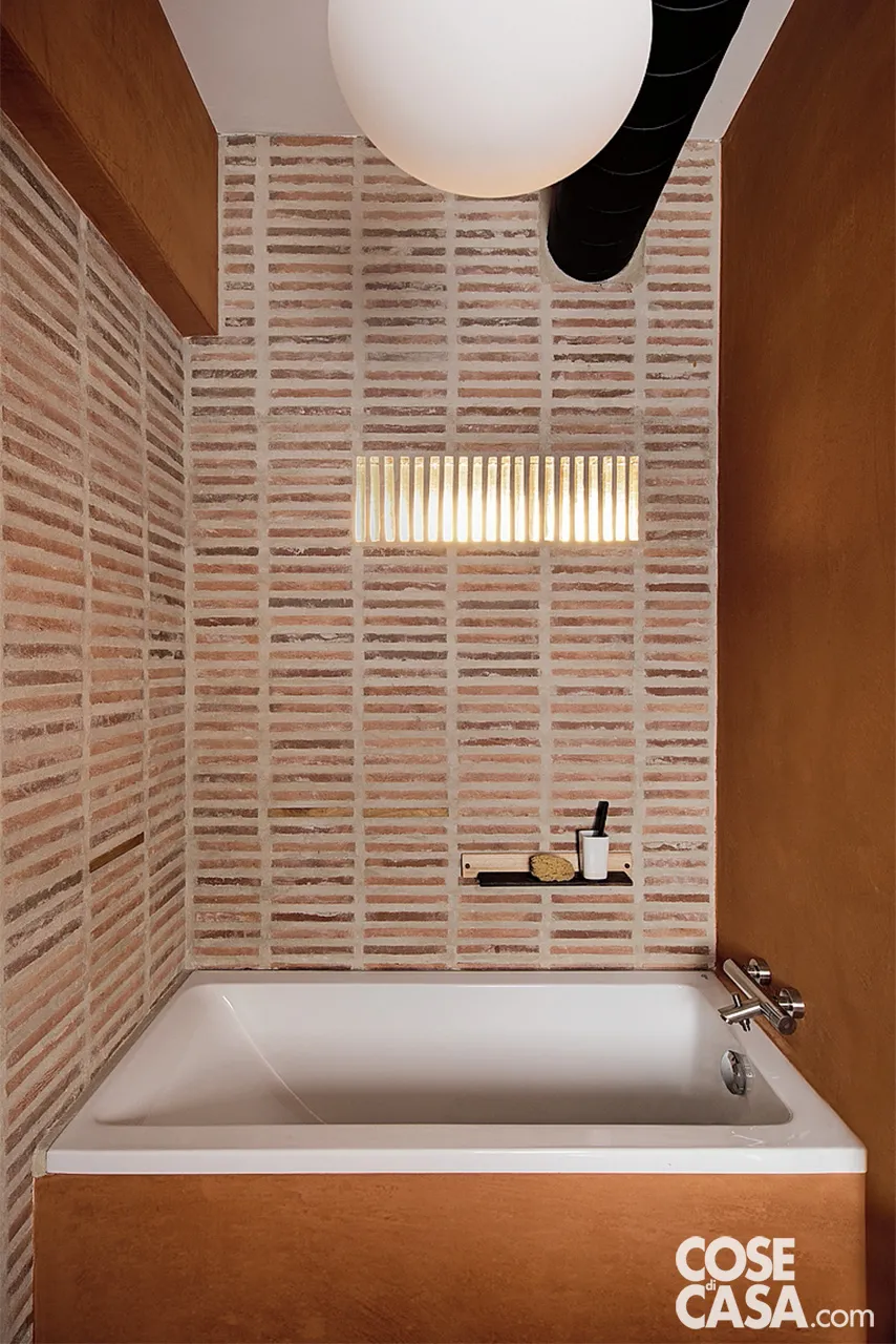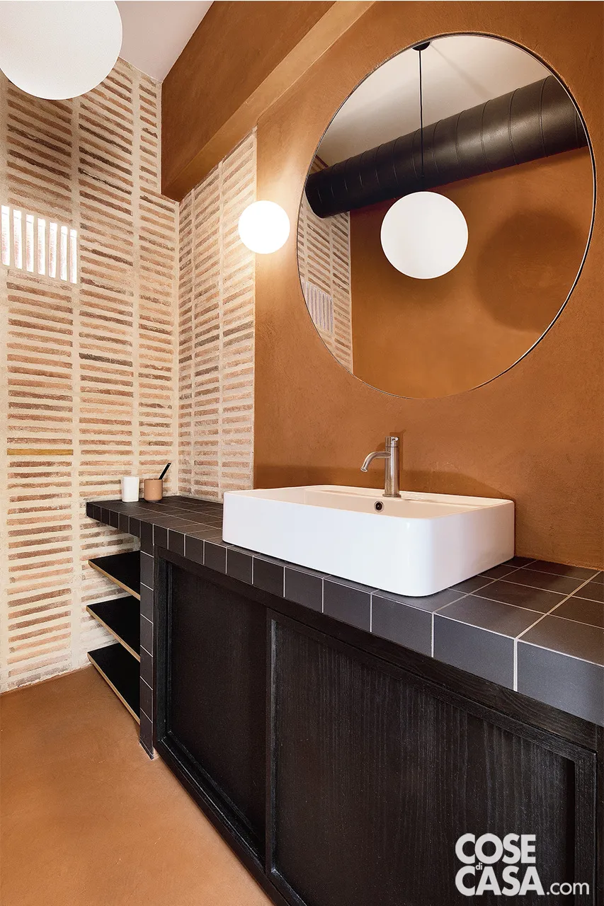 La lavorazione in cocciopesto impermeabile delle pareti del bagno è stata eseguita argianalmente da Danilo Dianti. All’interno del box doccia in muratura, il ribassamento in cartongesso green di oltre 40 cm contiene l’impianto di ventilazione meccanica del bagno cieco.
