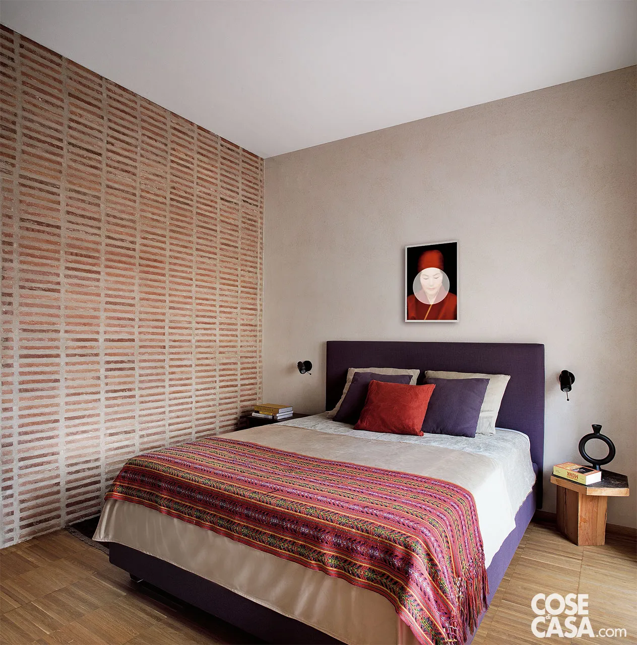 Il letto tessile con contenitore sotto la rete è di Artigiana Materassi, i comodini sono stati realizzati su disegno. Le applique nere nella zona lettura sono le Biny Spot Light di DCW Editions. Le tavelline che formano la parete sono della fornace Ballatore.
