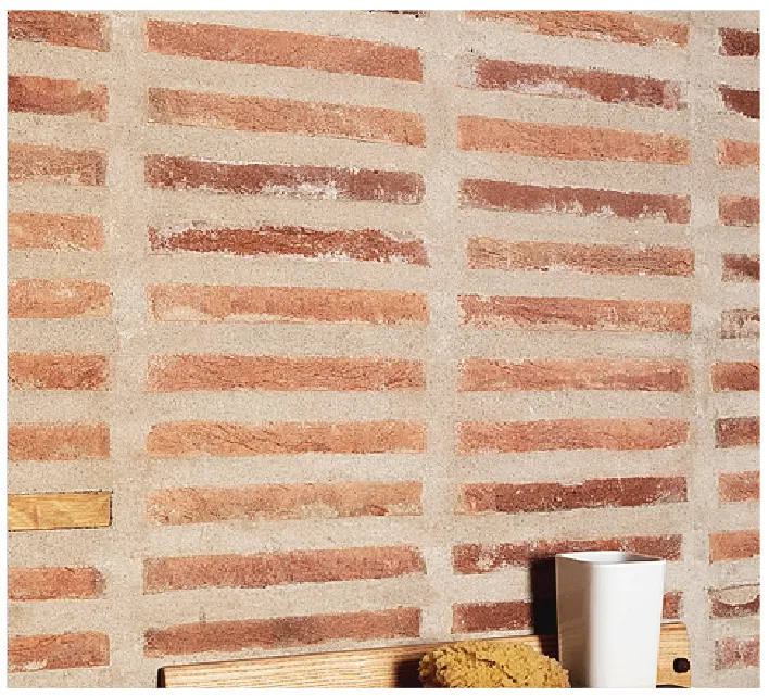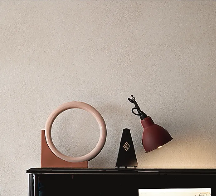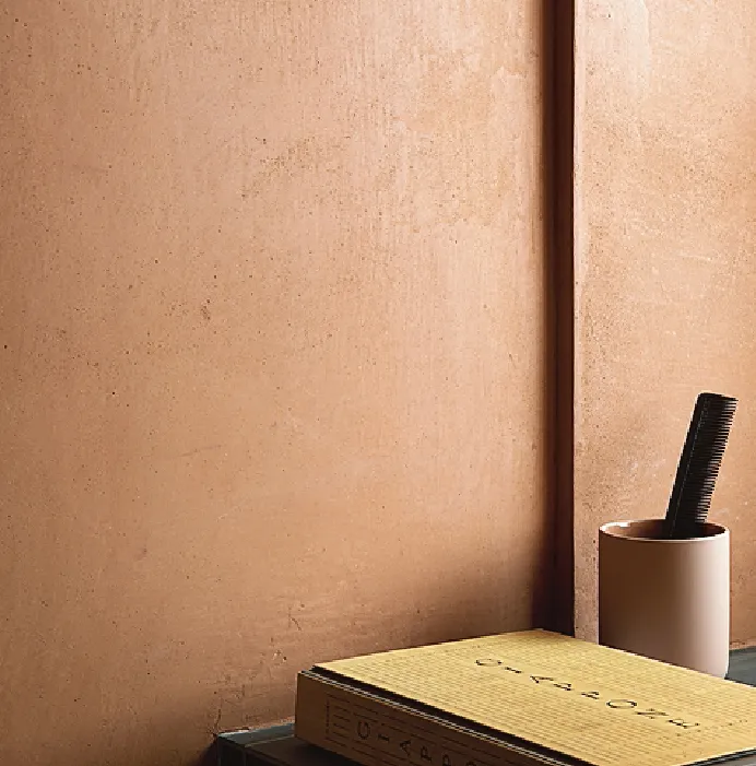 Le pareti di ingresso, cucina e bagni sono trattate con un intonachino in questo materiale, realizzato artigianalmente con mattoni sbriciolati in polvere fine e legati con grassello di calce. Il colore arancione è quello naturale del cocciopesto, la superficie risulta ruvida. Lo spessore è di pochi millimetri, l’estetica opaca e materica.