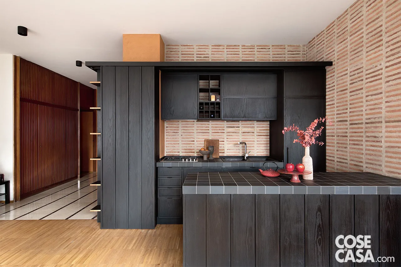 L’ingresso è raccordato alla zona giorno dalla libreria su disegno che, alla stessa altezza e nella stessa finitura nero opaco, prosegue a 90° come composizione della cucina. L’angolo operativo è delimitato dalla penisola che offre un ampio piano di lavoro in più e contiene nella base scomparti contenitori e il forno da incasso