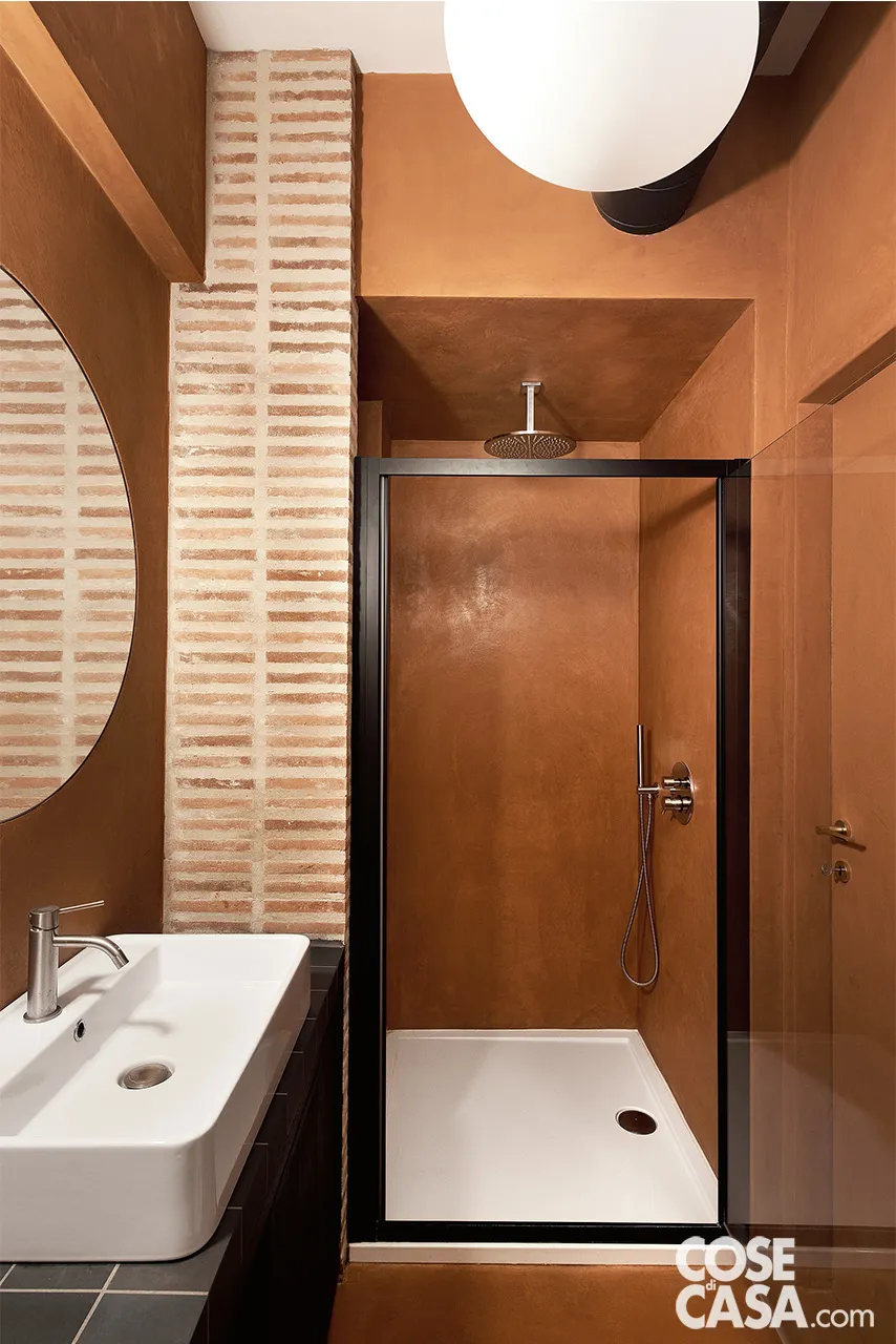 La finitura delle pareti e all’interno del box doccia è in cocciopesto come nella zona giorno, sottoposta a ulteriori lavorazioni che impermeabilizzano le superfici. Il materiale viene compattato e lisciato più volte per “chiuderlo” ed eliminare le porosità. Ancora a fresco, si esegue inoltre un trattamento finale con sapone nero marocchino che rimane così insolubile, in uno strato che protegge le pareti dall’acqua e dall’umidità.