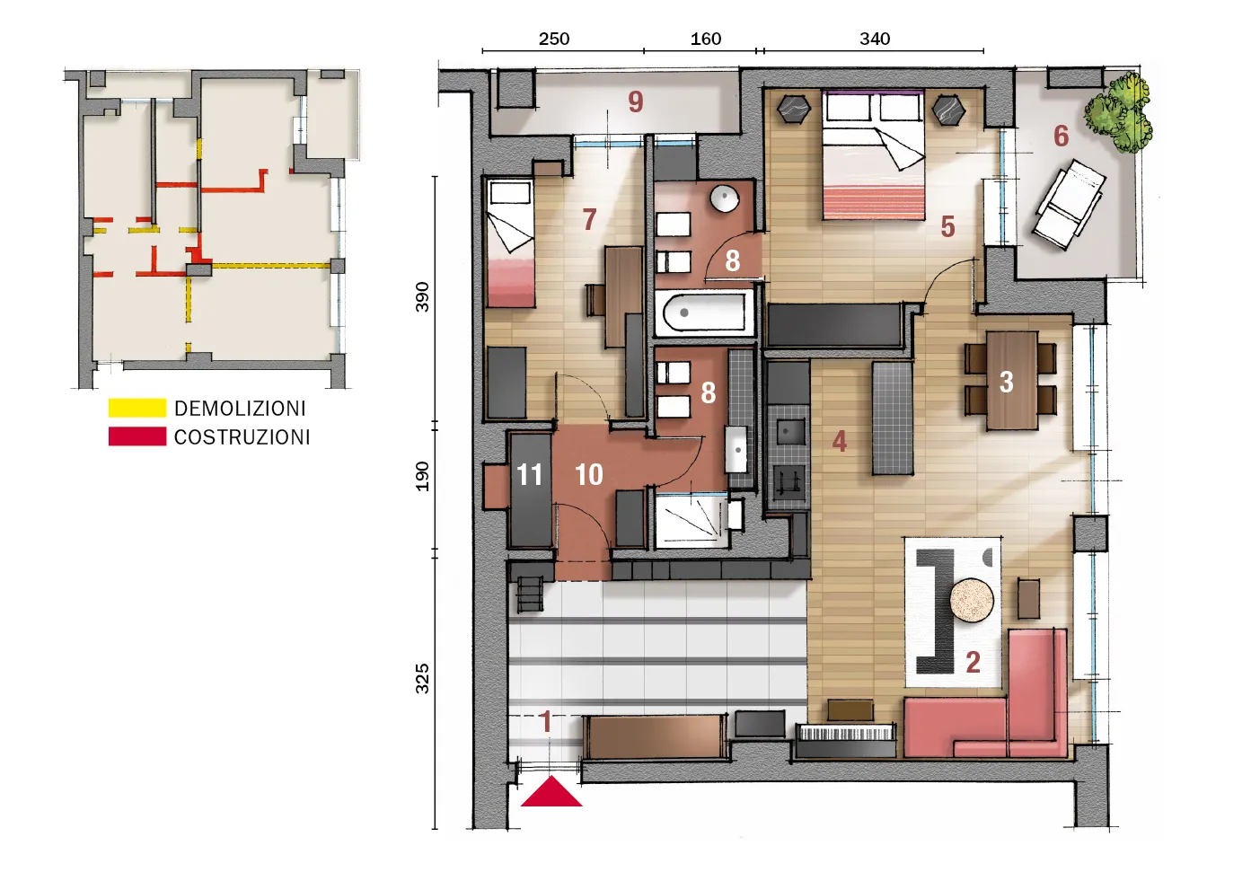 1 Ingresso 2 Zona conversazione 3 Area pranzo 4 Angolo cottura 5 Camera matrimoniale 6 Terrazzino 7 Camera 8 Bagno 9 Balcone 10 Disimpegno 11 Lavanderia
