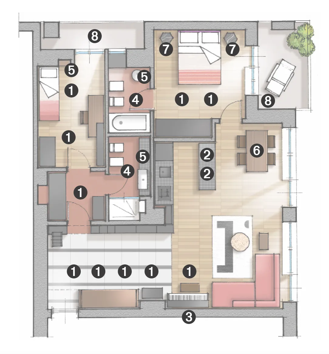 Vellutati colori della terra, decori, legno massello e lavorazioni artigianali, linee essenziali degli arredi e accessori a tema: dal punto di vista stilistico, il progetto d’interior decoration persegue l’obiettivo di creare, tra un ambiente e l’altro, un esplicito legame tra la cultura occidentale e quella orientale. Sono presenti in particolare citazioni Japan, a cominciare dalle tonalità terracotta di pareti e tessuti contrapposte alle finiture nero opaco dei mobili di falegnameria.
