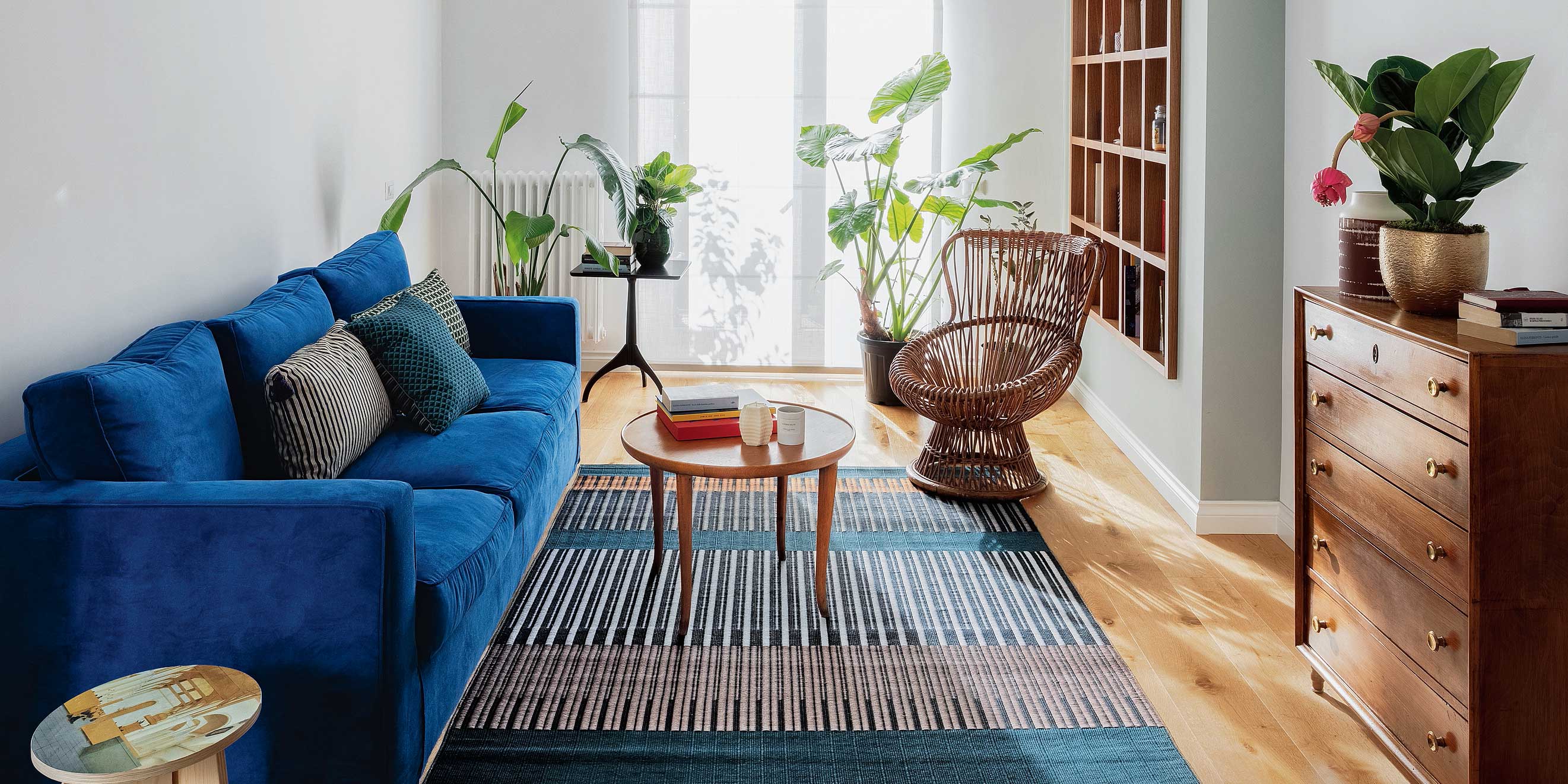 Soggiorno compatto con libreria in legno incassata nella parete, poltroncina in rattan di design e una vecchia cassettiera