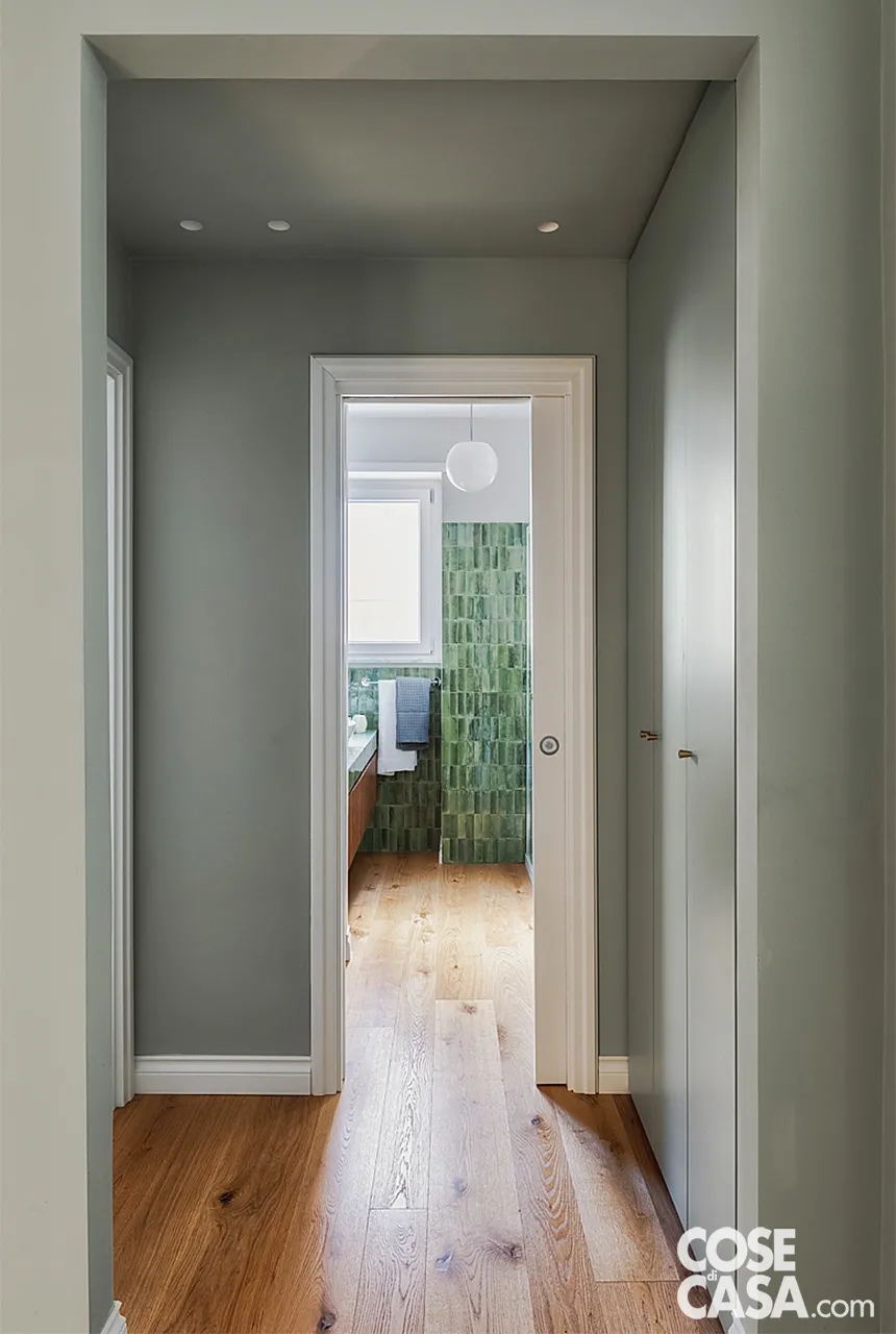 Il verde del bagno degli ospiti e il blu di quello della camera matrimoniale, declinati in elementi ceramici di formati differenti – rispettivamente listelli rettangolari posati in verticale e quadratini – evidenziano caratteristiche comuni.