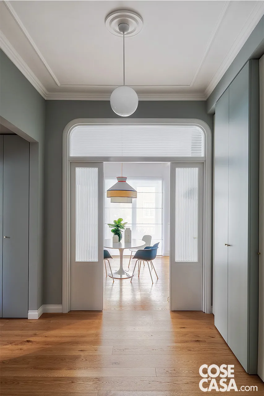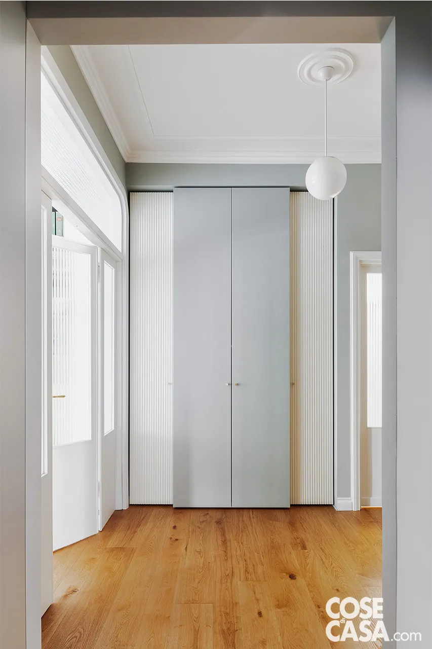 La lavorazione cannettata è un elemento di raccordo che ricorre nell’abitazione. All’ingresso, listellature verticali contraddistinguono i pannelli vetrati opalini delle porte, attraverso cui si intravedono soltanto le ombre; mentre la variante orizzontale dello stesso motivo lineare è utilizzata per il sopraluce. La stessa texture è ripresa nei frontali dell’armadiatura incassata in nicchia nell’angolo tra le porte della sala da pranzo e del disimpegno; le ante centrali del mobile sono invece laccate nello stesso azzurro acqua marina della parete.
