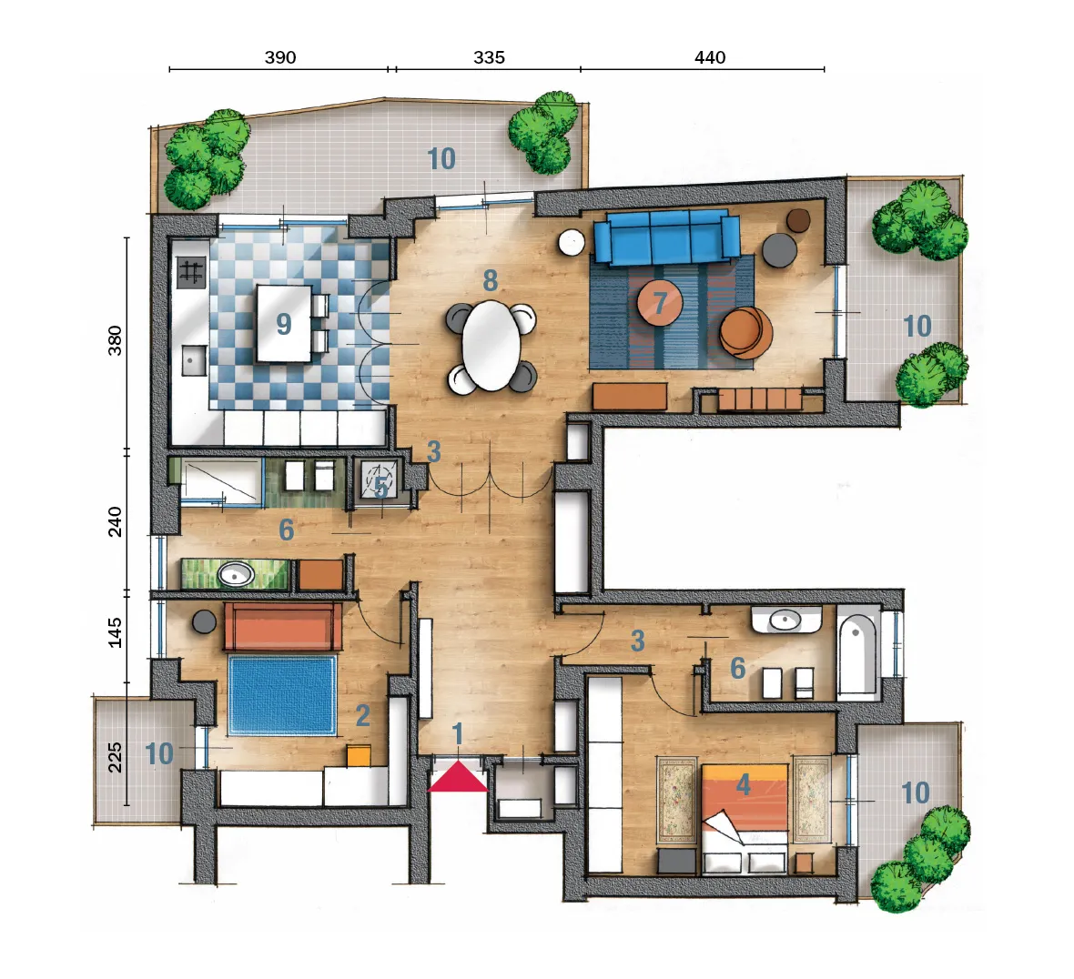 1 Ingresso 2 Studio 3 Disimpegno 4 Camera matrimoniale 5 Antibagno/lavanderia 6 Bagno 7 Soggiorno 8 Sala da pranzo passante 9 Cucina 10 Balcone