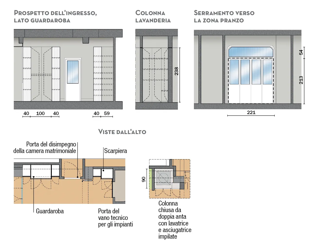 Nell’ingresso, oltre al guardaroba, è stata ricavata sullo stesso lato lungo la parete la colonna lavanderia che occupa il volume di risulta tra il bagno e il pilastro aggettante lungo il muro.