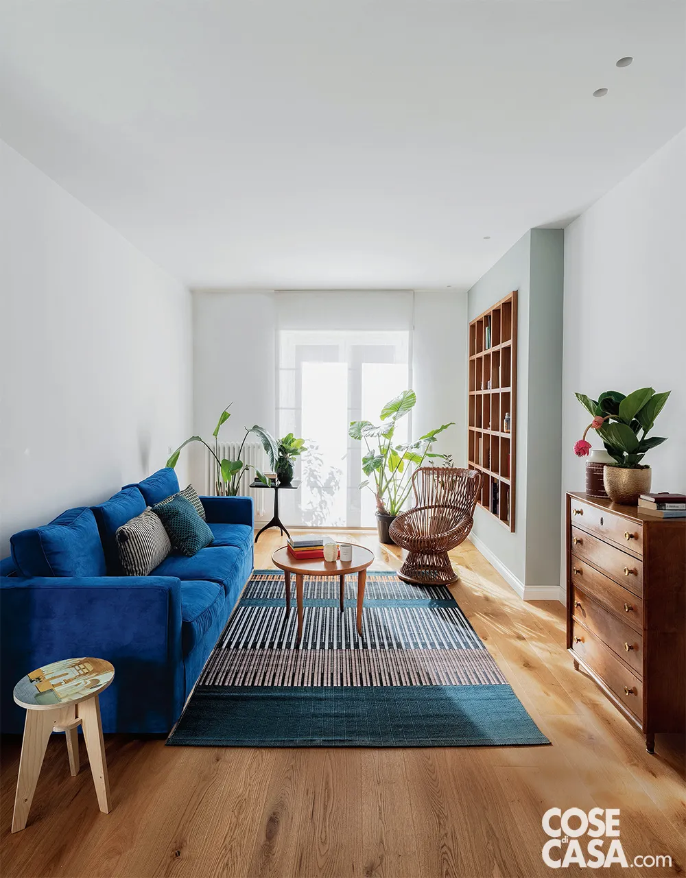 La zona conversazione del living (foto della pagina a sinistra) è illuminata dalla portafinestra affacciata su un balconcino. Davanti al divano rivestito in tessuto blu, il tappeto è di Karpeta; i cuscini sono di Galleria Mia così come il tavolino di fianco al bracciolo dell’imbottito. Il coffee table centrale è di Spazio Aperto. Nella foto a destra, la libreria a giorno in rovere, incassata nella parete, è stata realizzata su disegno dei progettisti. La poltrona in rattan è Margherita disegnata da Franco Albini, acquistata da Spazio Ampio. Il parquet in rovere anticato spazzolato è di Mardegan.