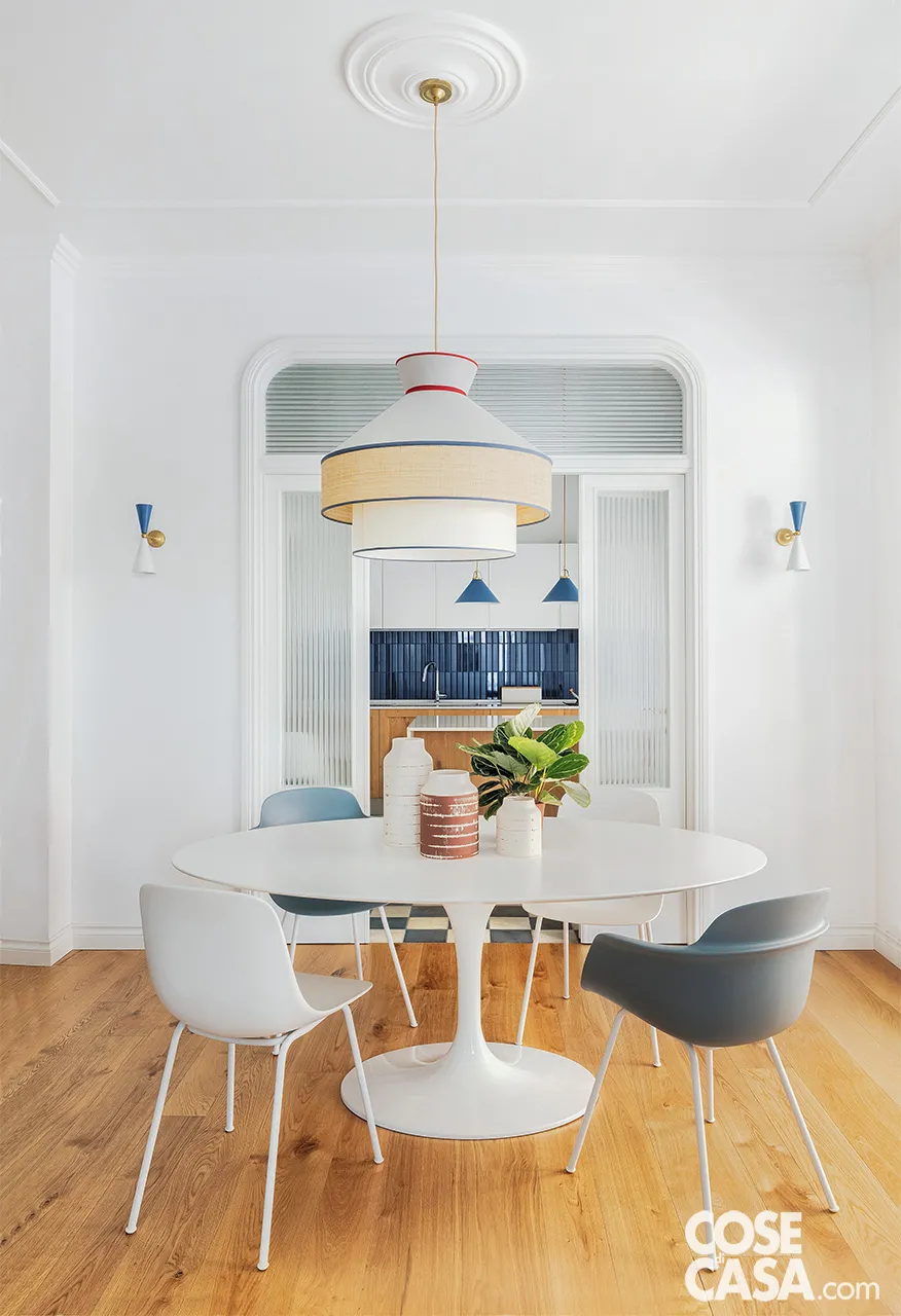Nella zona pranzo il tavolo è stato rilaccato dall’impresa TeHome. I vasi appoggiati sul piano sono di Coin. La lampada a sospensione in tessuto e le due applique a megafono sono state acquistate da La Piccola Bottega.