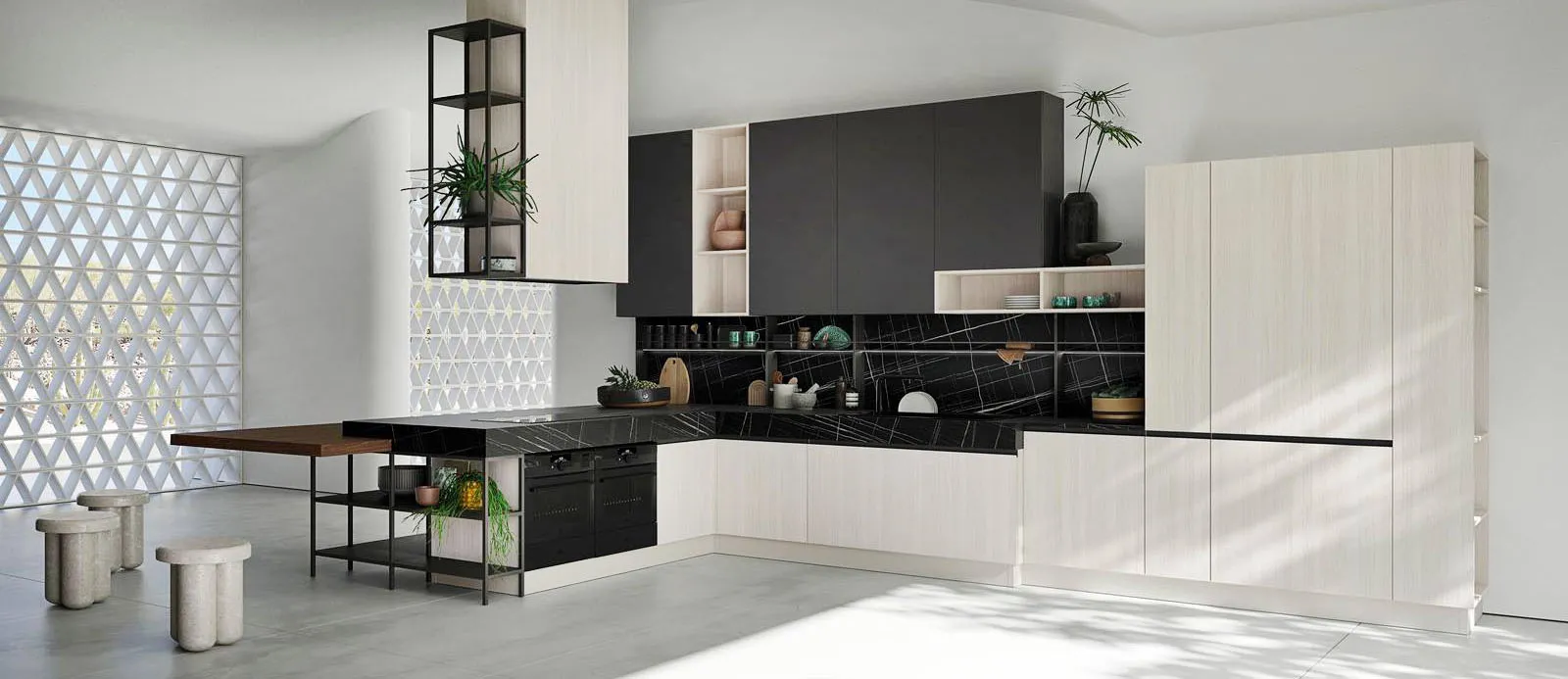 La cucina angolare con penisola Up Design di Ar-Tre è pratica e funzionale grazie anche alle ante delle basi e delle colonne in melaminico a poro registro effetto legno chiaro, un materiale resistente, versatile e durevole, con un ottimo rapporto qualità/prezzo. Lo schienale attrezzato, con elementi in metallo, è coordinato con la finitura del piano effetto marmo nero e permette di appendere attrezzi e accessori da avere a portata di mano. Prezzo su richiesta. https://www.ar-tre.it