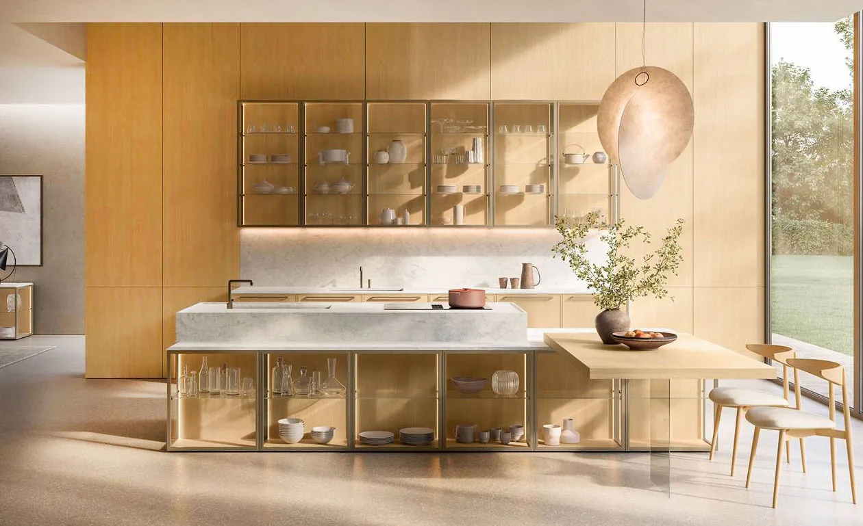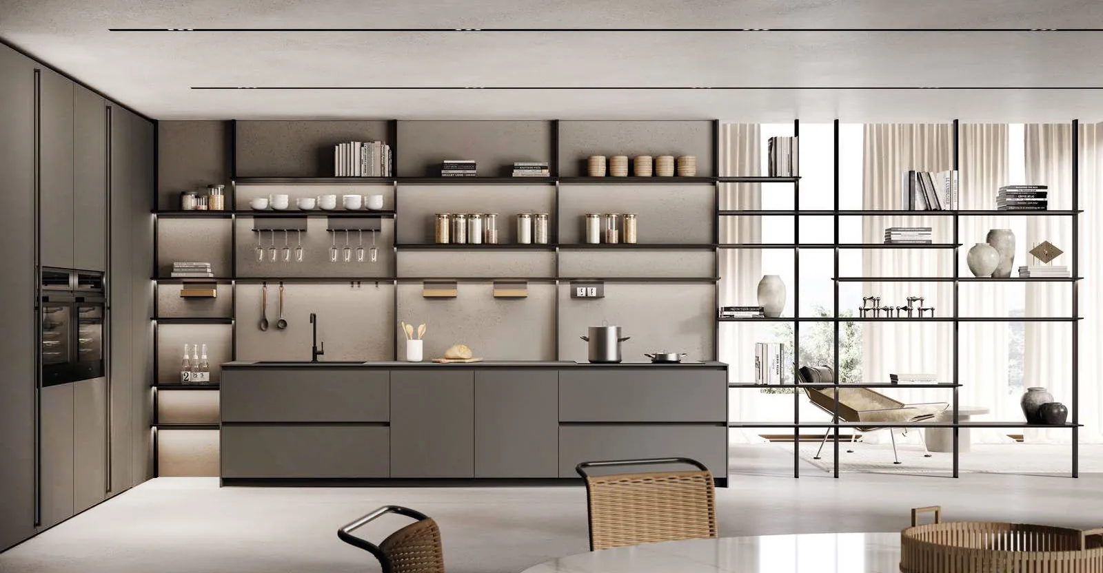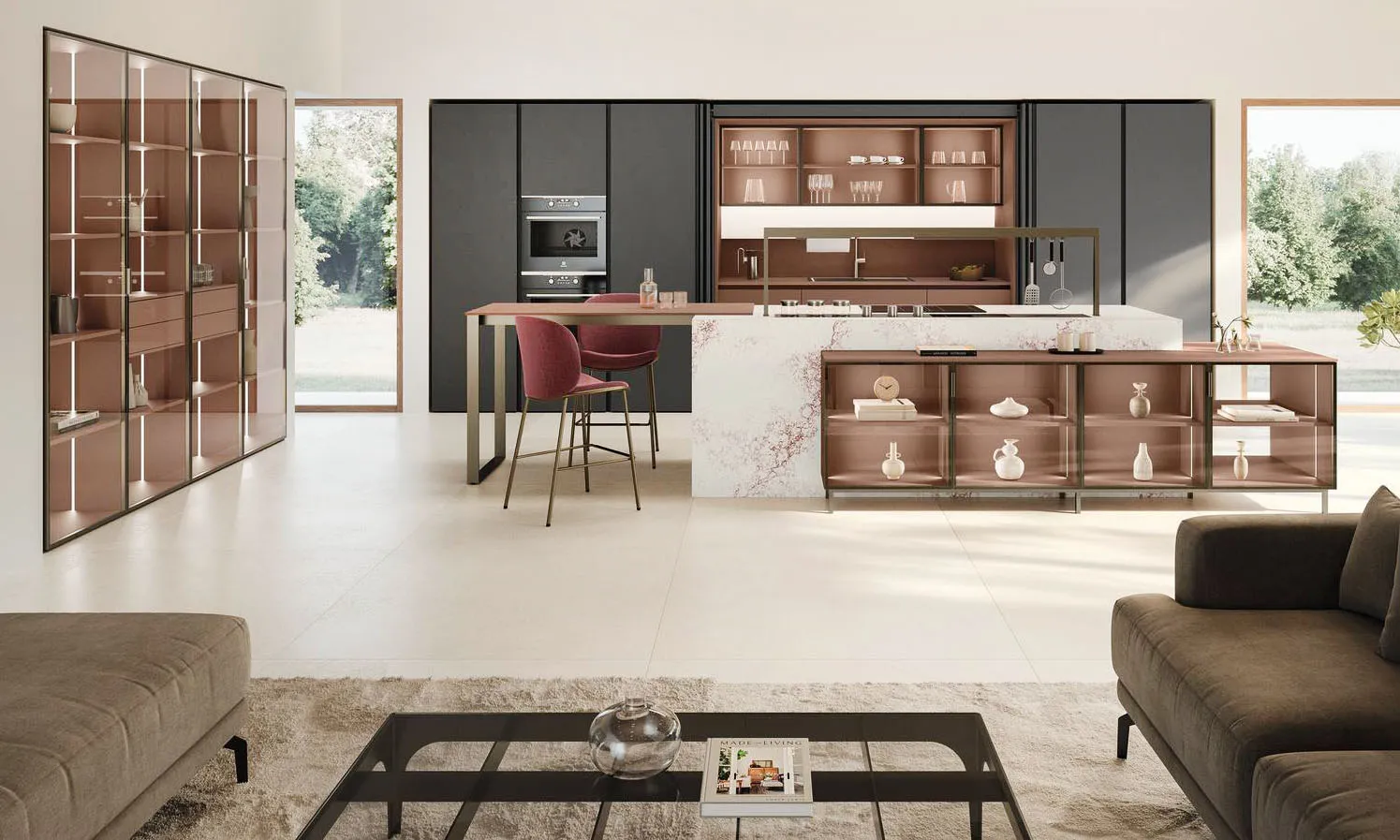 Le aziende propongono oggi sistemi d’arredo evoluti, pensati per organizzare lo spazio senza separarlo rigidamente: isole e penisole definiscono le funzioni, mentre librerie, armadiature e moduli passanti introducono filtri leggeri tra le zone.
