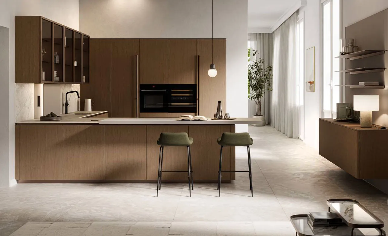 Non si tratta più di “nascondere” la cucina, ma di ridefinirne il ruolo attraverso scelte materiche e formali molto più assertive.