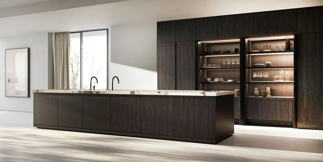 La cucina Ak_Project con sistema Lift e nuovi sistemi Feeling Home di Arrital rafforza il dialogo tra i sistemi cucina e la zona living sottolineando la continuità tra funzione e comfort. La finitura laccato Iron costruisce un piano materico compatto e sofisticato, capace di assorbire la luce e restituirla con misura. Attraverso la boiserie Planar in Noce Carbo la parete si trasforma non solo in un’architettura, ma in un elemento attivo che connette le funzioni fino a integrarsi nel Pass System, una soluzione che separa senza interrompere, definendo un passaggio fluido e continuo tra la cucina e il living. https://www.arrital.it – Fuorisalone, Showcase Arrital – Corso Europa 22, Milano.
