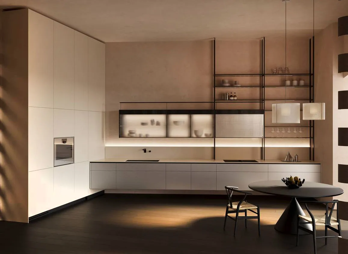 Un altro tema emergente è quello della “separazione intelligente”. Dopo anni di open space totale, si assiste a un ritorno — più sofisticato — di soglie e filtri. Non muri, ma dispositivi progettuali: pannelli autoportanti, sistemi passanti, quinte attrezzate. La cucina non viene più completamente assorbita nel living, ma torna a definire un proprio ambito, pur restando visivamente connessa.
